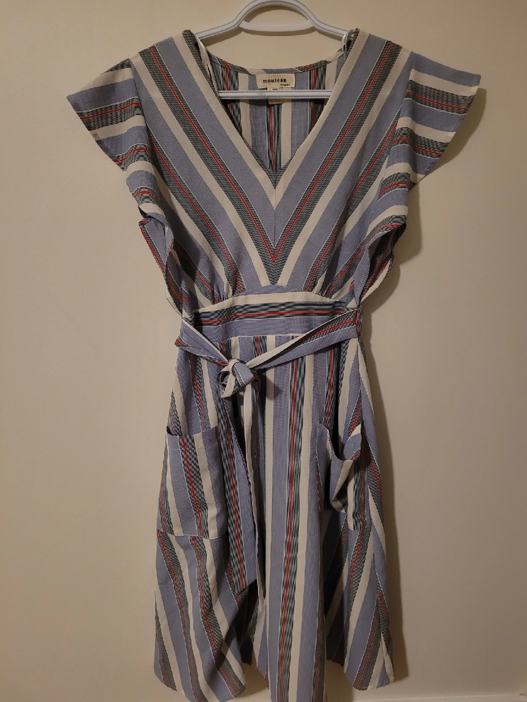 Cute Monteau Los Angeles dress in a striped pattern! It features a V-neck, short sleeves, and a tie waist. Perfect for a casual summer day! Size is Small