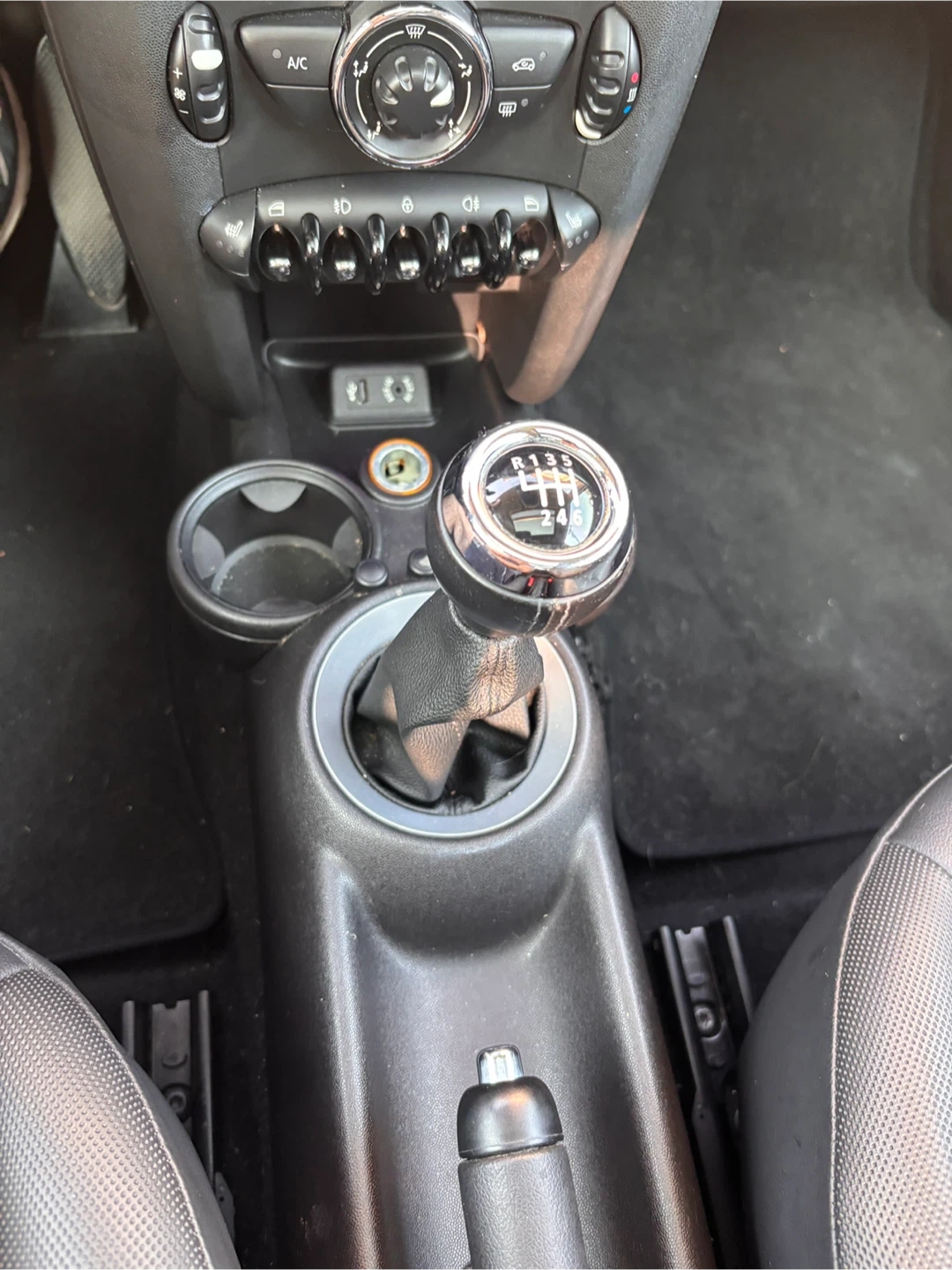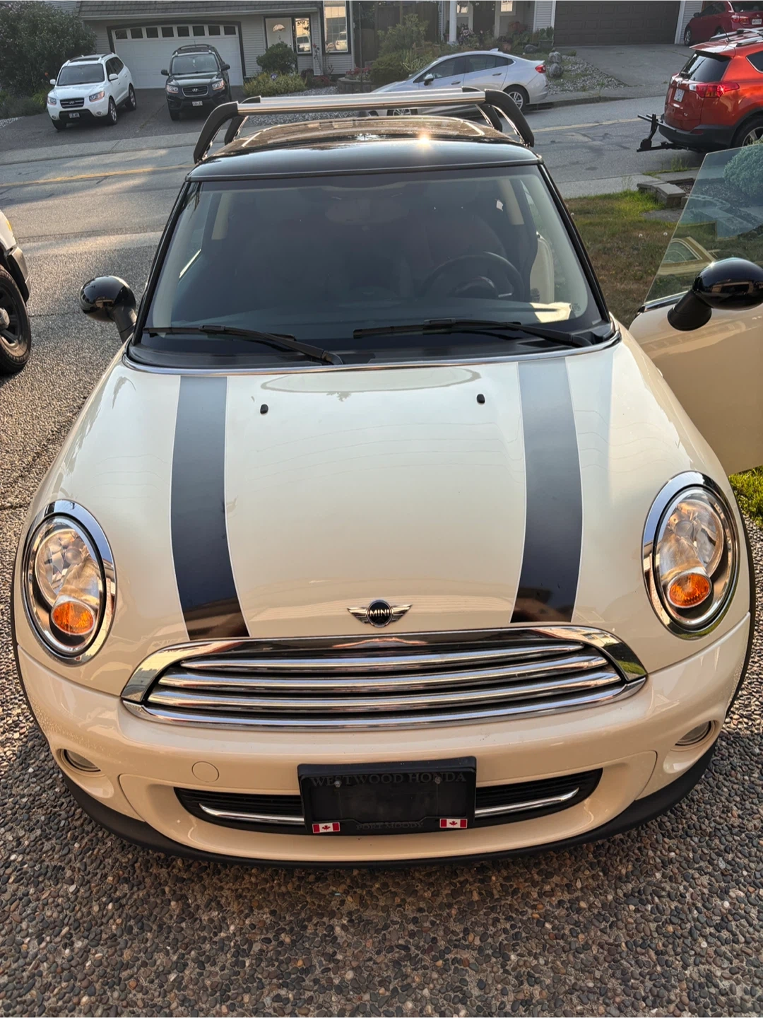 Selling a Mini Cooper Hatchback with a cream-coloured exterior and black interior. Dark tinted windows, rooftop carrier. This car has a 6 speed manual transmission. It's in great condition and fantastic on gas. Air con doesn’t get fully cold but is ready for a new owner! Only about 85k.