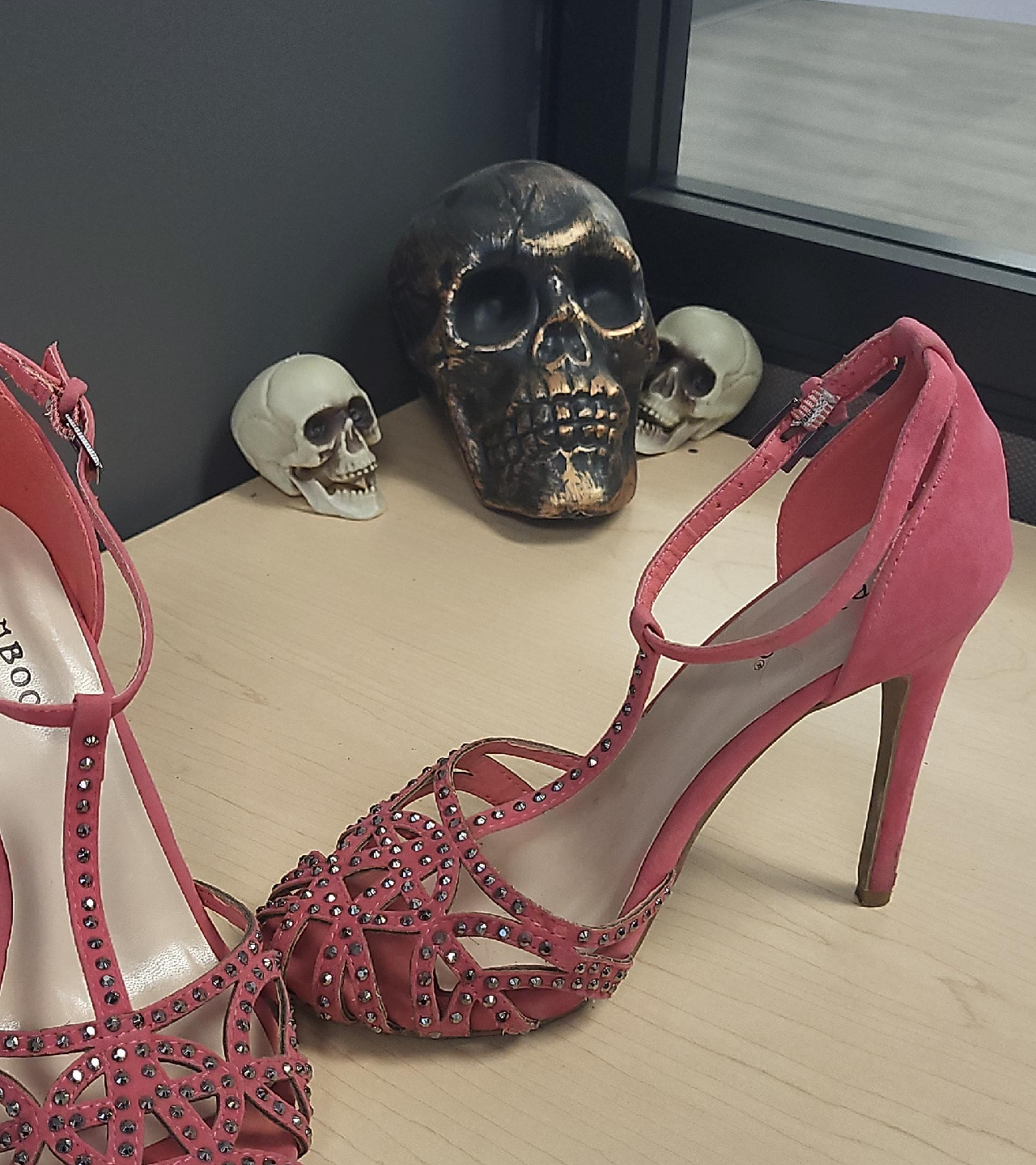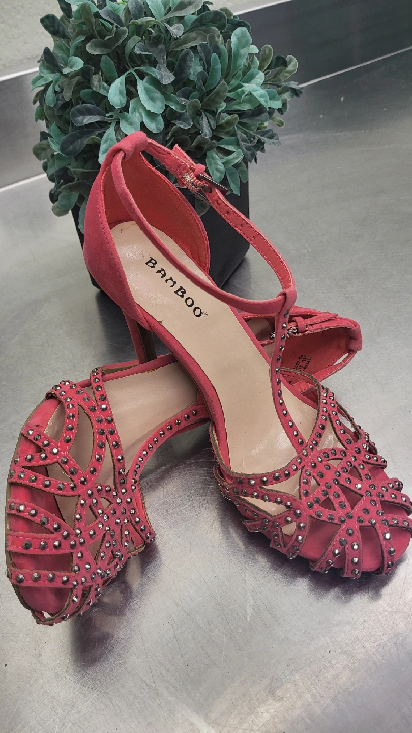 Bamboo heels in a vibrant pink colour! They are a size 6.5. These heels feature a stylish, studded design and ankle strap. Honestly...they are missing a few studs on the lower side, but it's not noticeable. They are still fabulous
