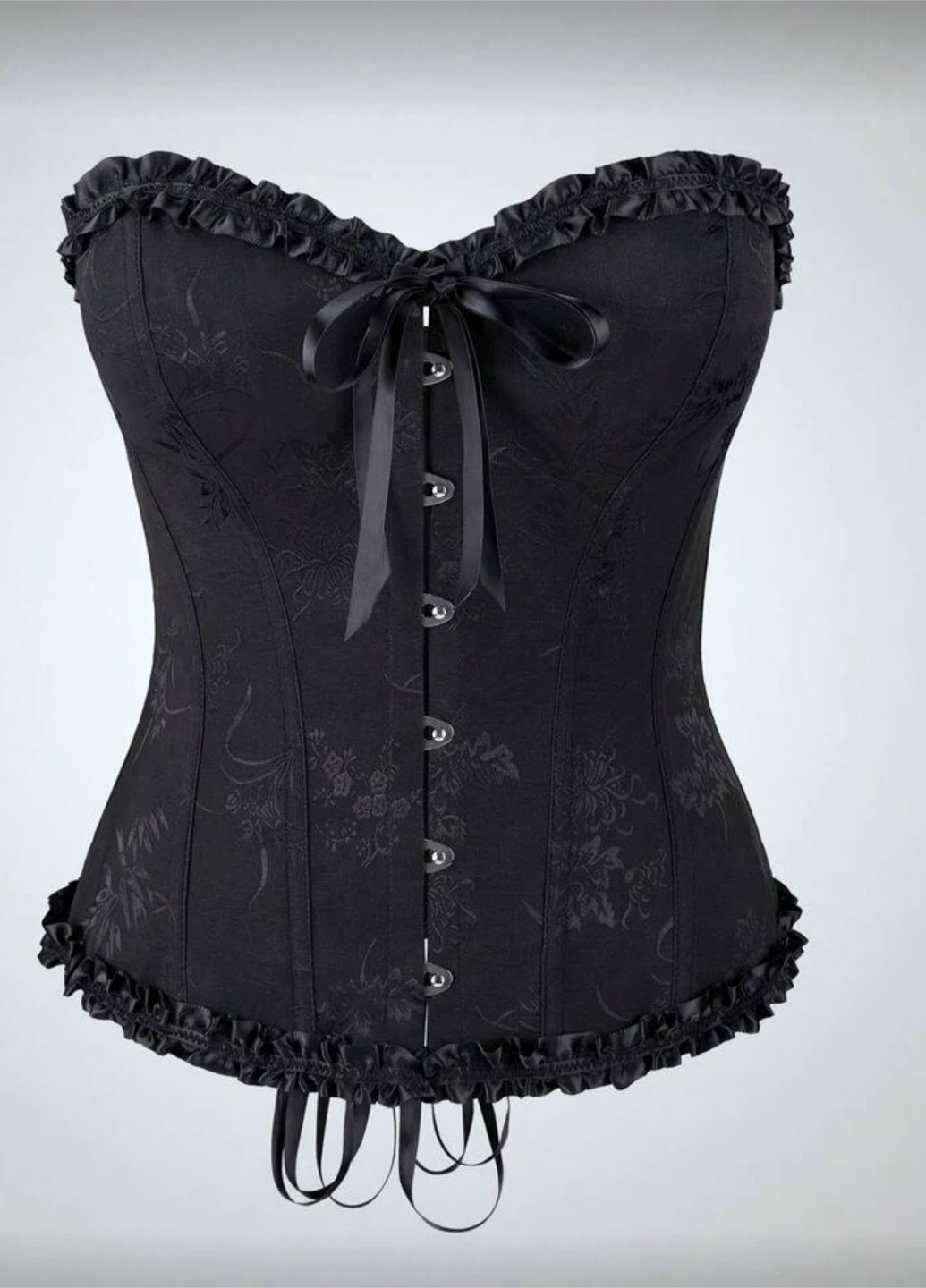 Here's a stylish black corset featuring ribbon detailing! It has a classic design with a ribbon tie in the front and ruffled edges. Perfect for adding a touch of elegance to any outfit