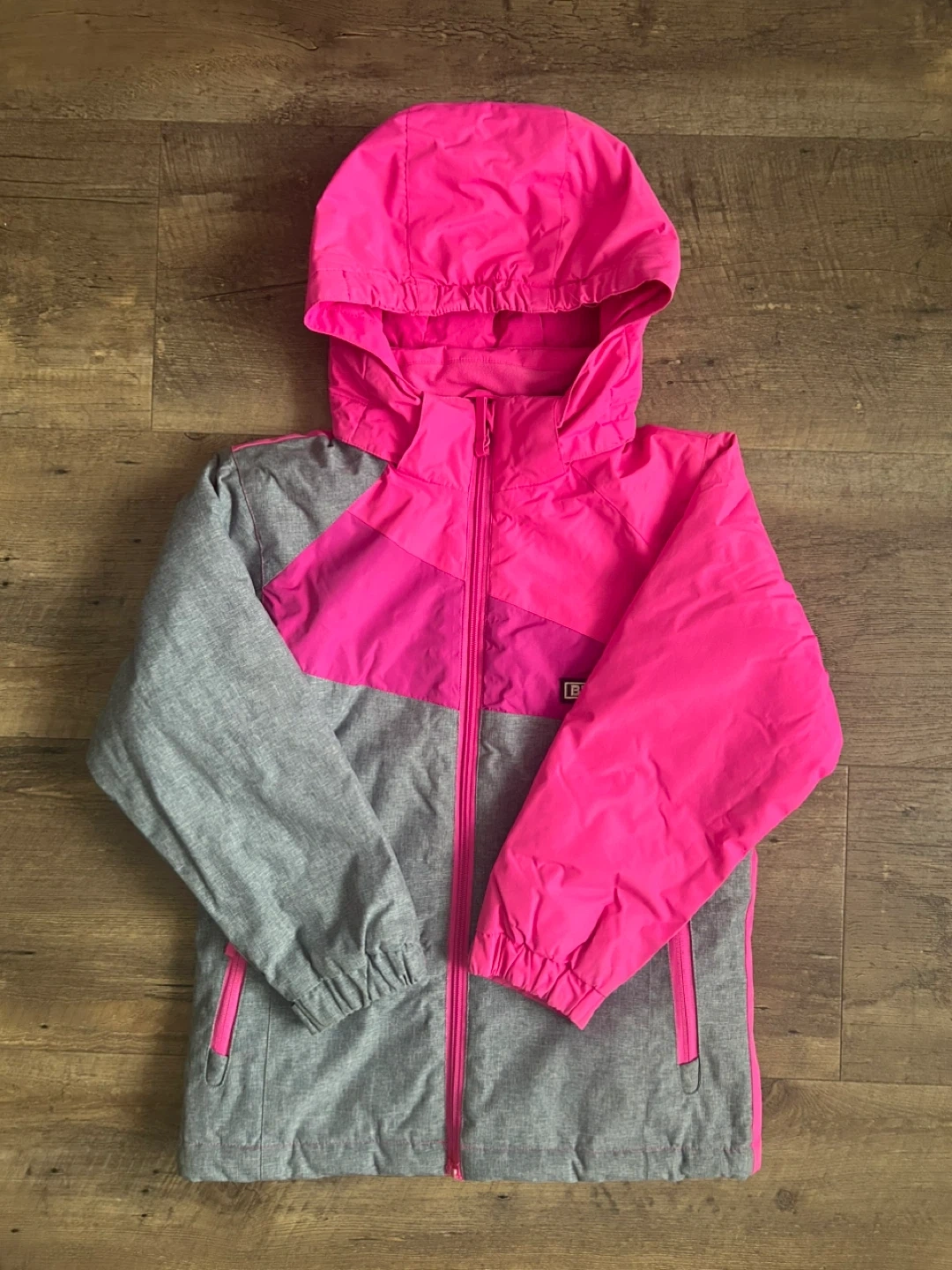 Winter jacket in a vibrant pink and grey colour block design. It's sized 6/7 and perfect for keeping your little one warm and dry during the colder months. Please note the zipper is damaged.