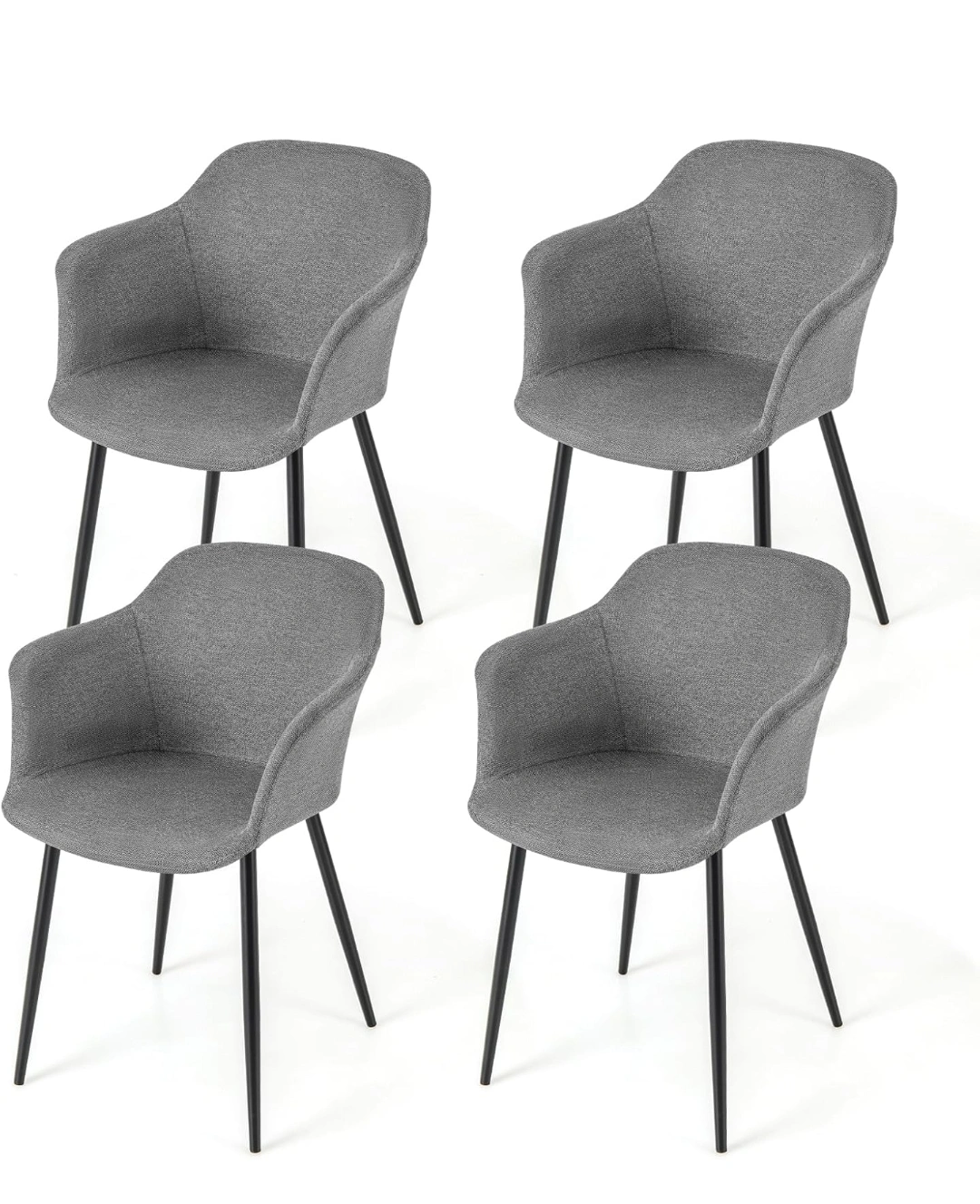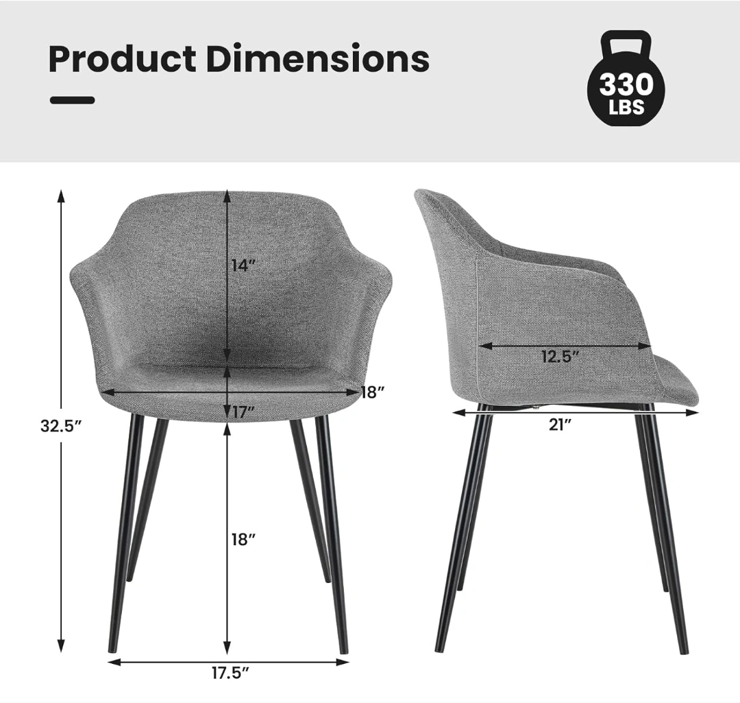 Here's are 4 stylish grey fabric dining chair! It has a modern design with black metal legs. The chair's dimensions are approximately 32.5 inches in height, 17.5 inches in width, and 21 inches in depth. The seat is about 14 inches wide and 12.5 inches deep, providing a comfortable seating experience