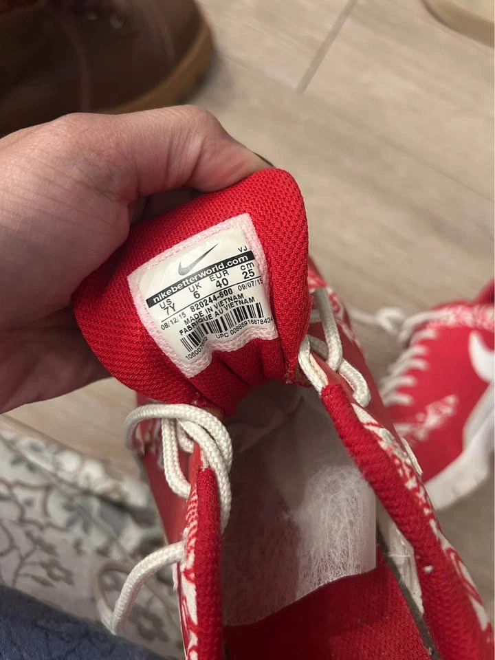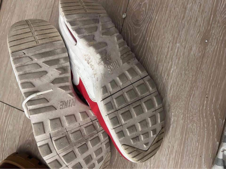 Selling a pair of Nike Air Max Thea sneakers in red and white. They are in used condition with some wear on the soles, but still have lots of life left! Size is US 7Y, UK 6, EUR 40, and 25 cm