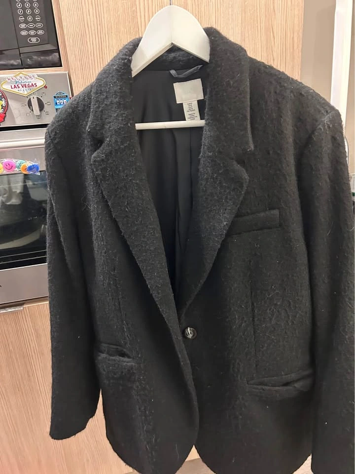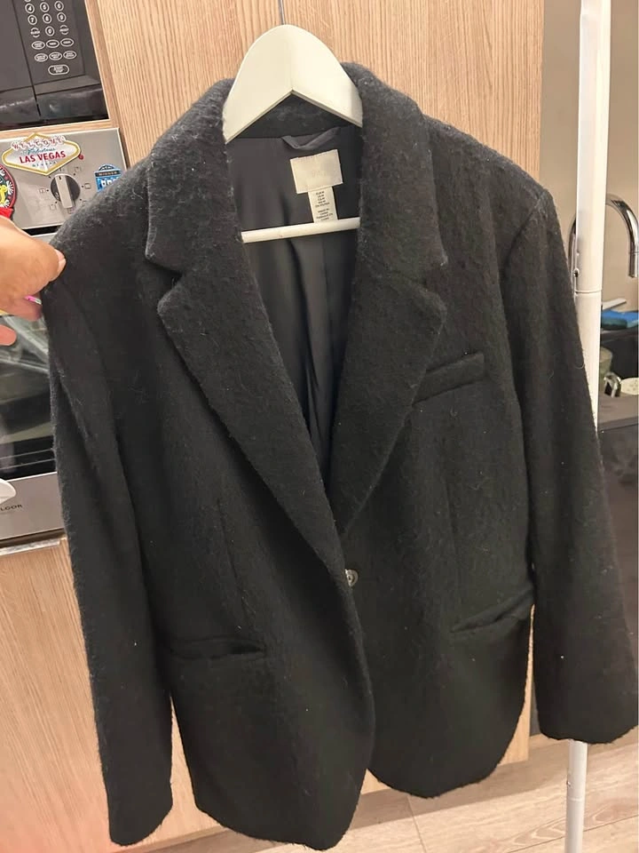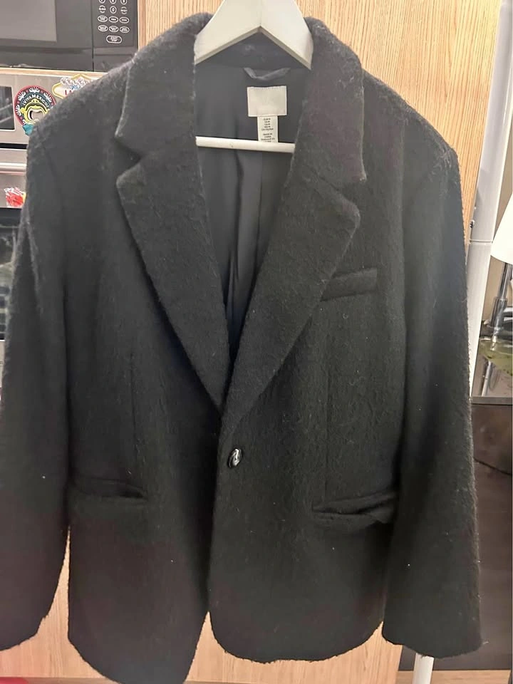 Selling a gently used black blazer from H&M. It's a size medium and in great condition. Perfect for adding a touch of style to any outfit! Not worn