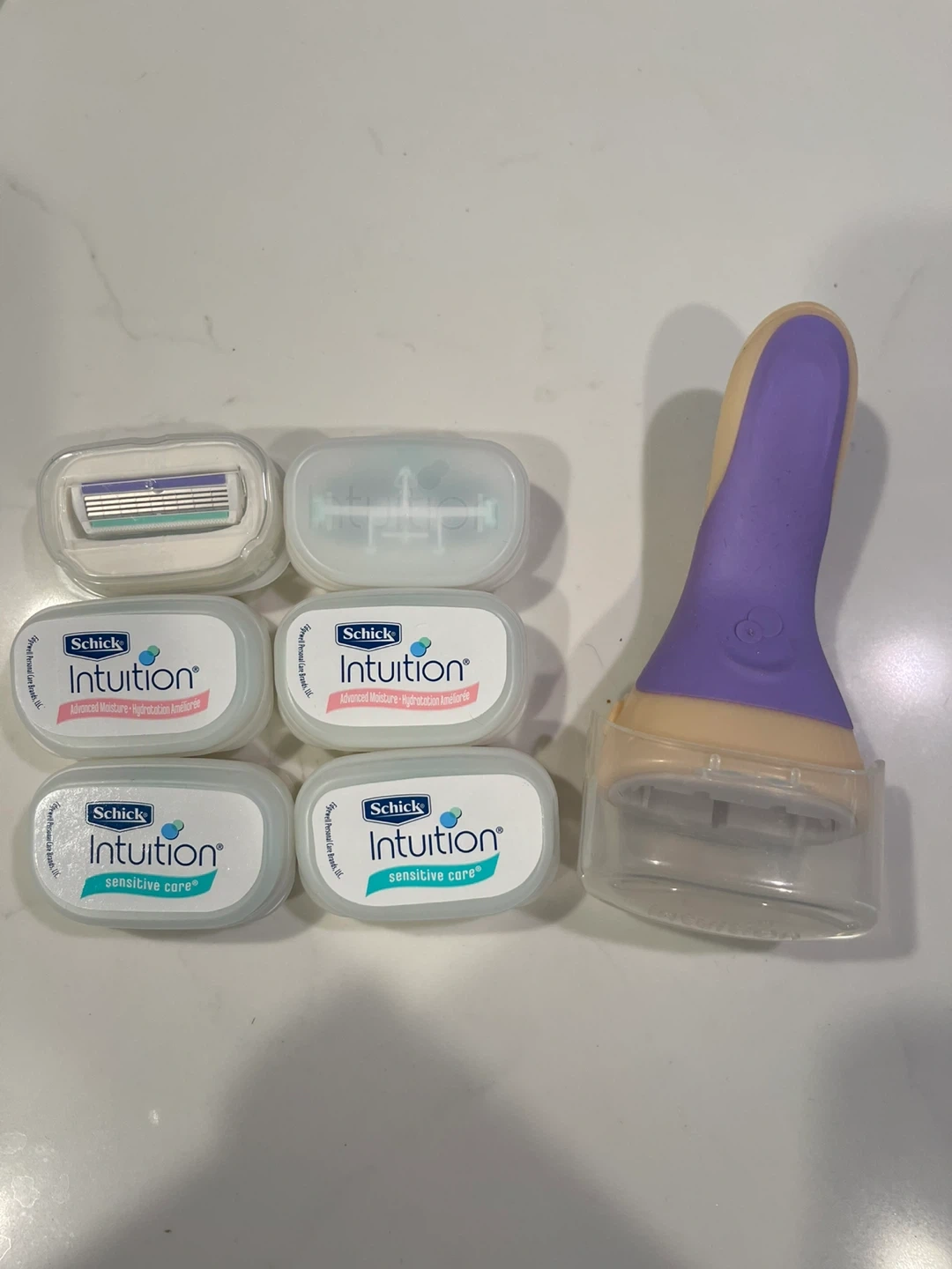 Selling a Schick Intuition razor with six refill cartridges! Three of the refills are for advanced moisture, and two are for sensitive care. Get everything you need for a smooth shave.