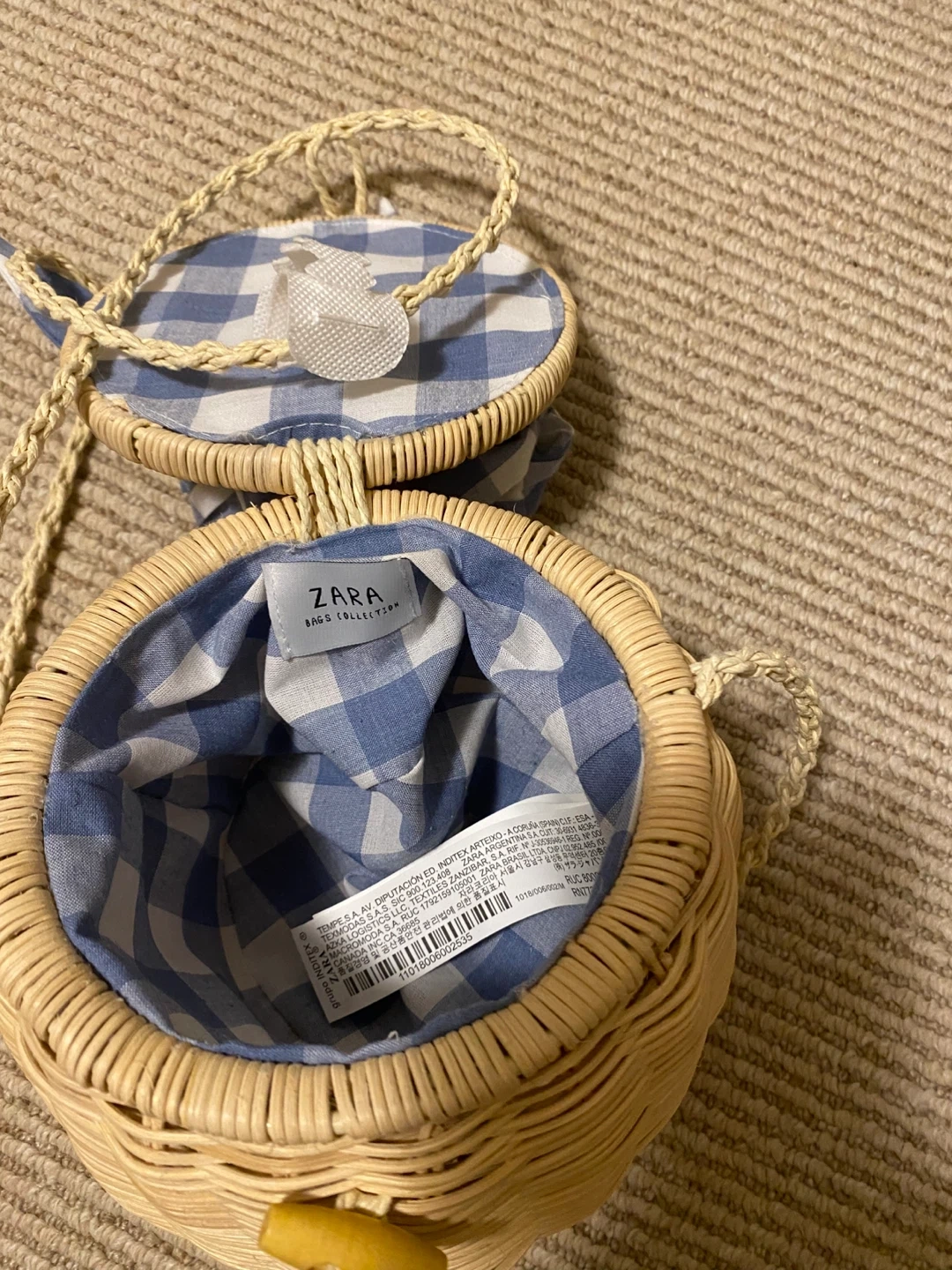 Super cute Zara round crossbody bag in a wicker material! The inside is lined with a blue and white checkered fabric. Perfect for spring and summer!