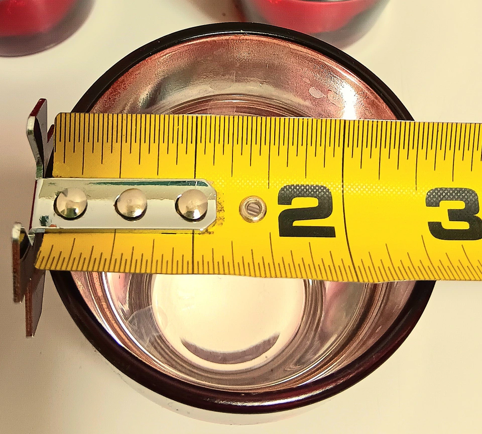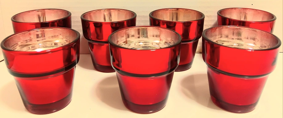 Add a touch of warmth to any room with these seven red glass votive holders, each designed to perfectly cradle tea lights or small candles. These votive holders are in good condition and ready to brighten up your space.