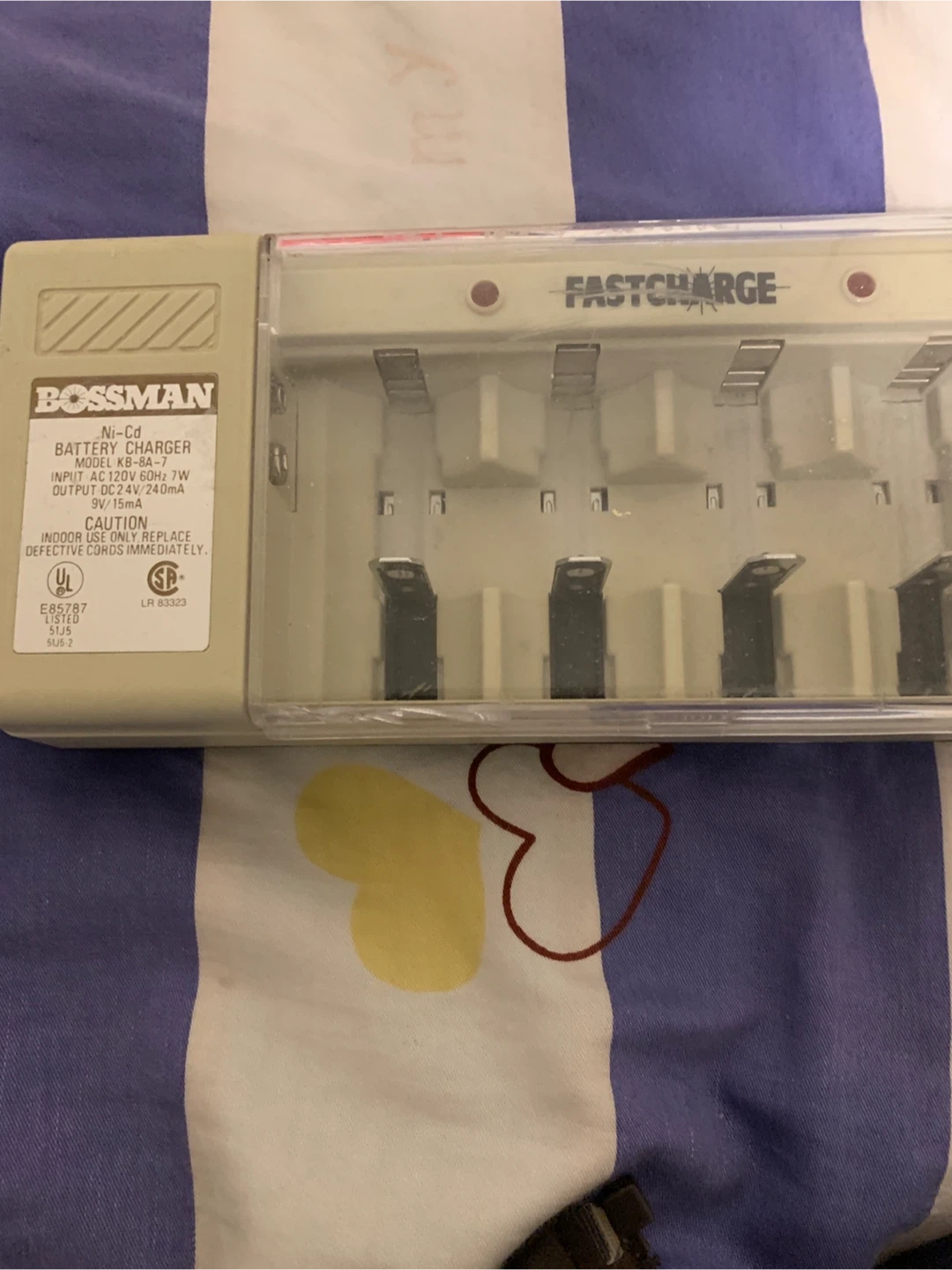 Selling a Bossman Ni-Cd battery charger, model KB-8A-7. It's a fast charge model. Input is AC 120V 60Hz 7W, and output is DC24V/240mA, 9V/15mA. Please use indoors only and replace defective cords immediately