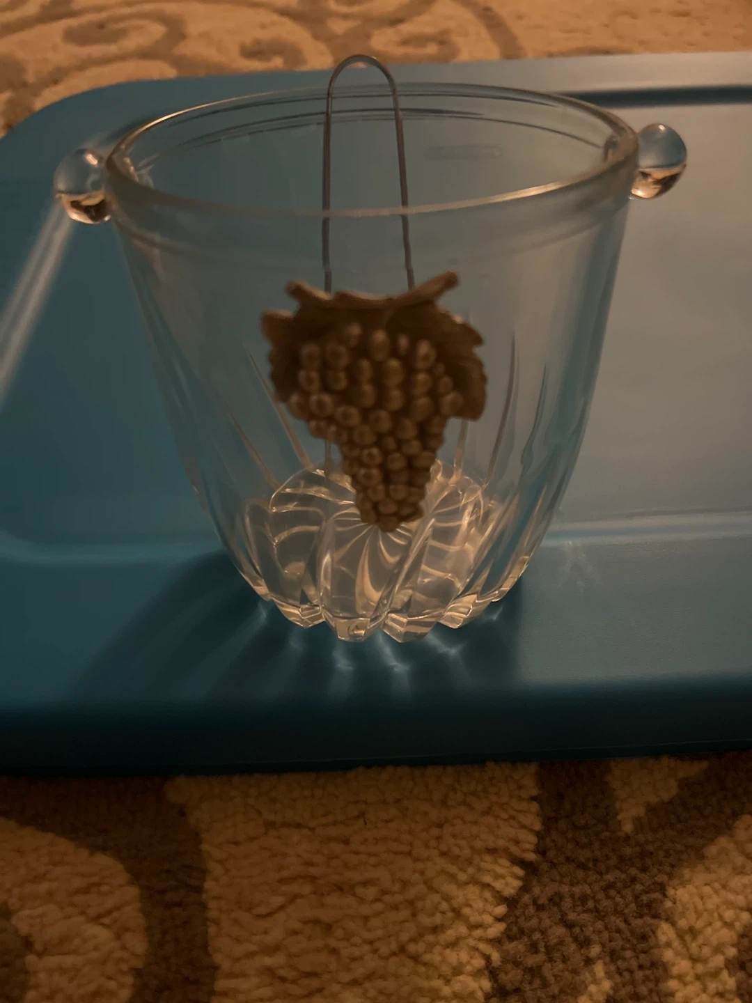 33Selling a clear glass ice bucket! It has a cute grape design on the front and a handle for easy carrying. Perfect for keeping your drinks cool during get-togethers or just for everyday use