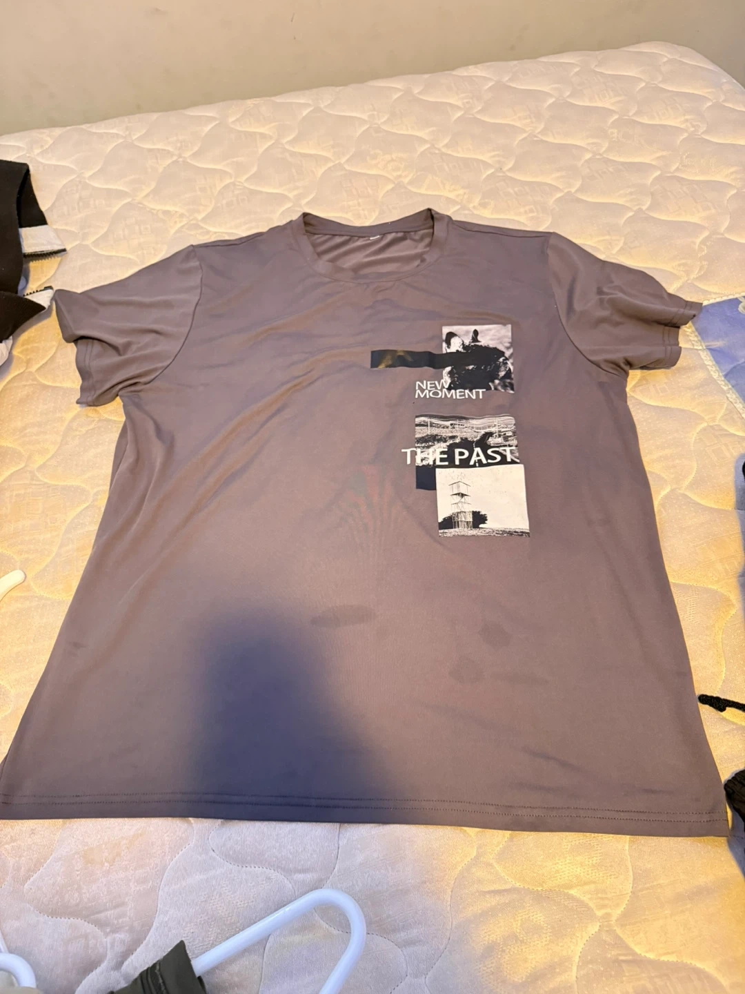 Selling a men's t-shirt with a 'New Moment' design. It's in great condition and ready for a new home. The colour is a stylish greyish-purple. Perfect for casual wear!