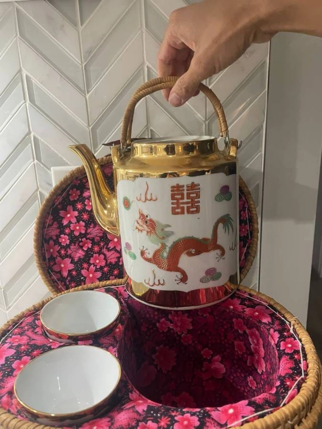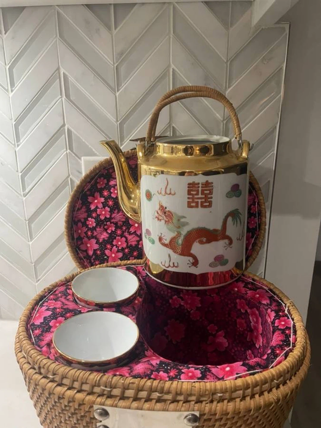 Selling a charming vintage Chinese tea set, complete with a teapot, two cups, and a delightful basket carrier. The teapot and cups feature intricate dragon designs and gold trim, adding a touch of elegance. The basket is lined with a vibrant floral fabric, making it a perfect set for tea lovers or collectors!