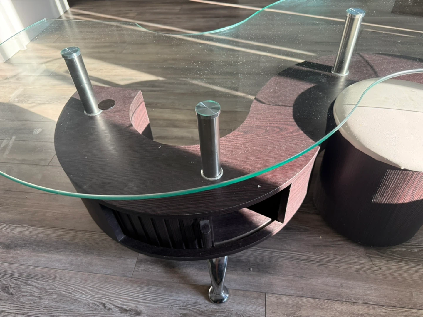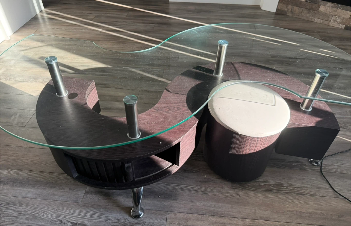 Selling a unique yin yang style coffee table. It features a glass top and a dark wood-like base with two attached stools. A very interesting piece for any living room!