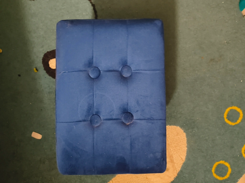 Selling a cute blue ottoman foot stool. It's in good condition and would be a great addition to any living room or bedroom. The ottoman features a soft, cushioned top and sturdy legs.