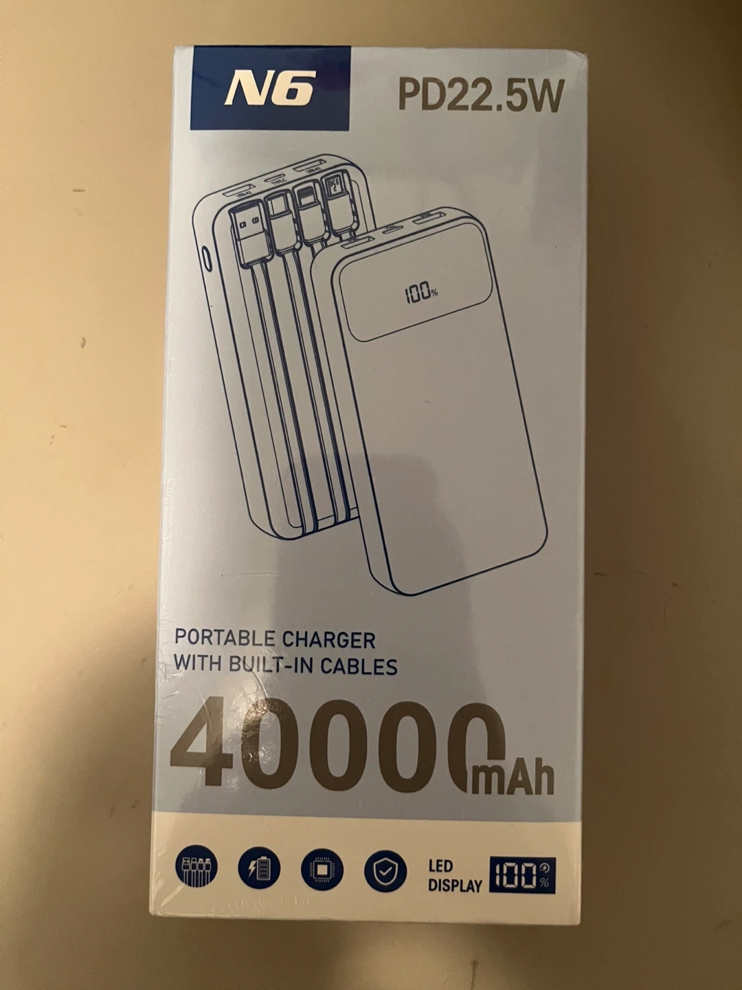 Selling a N6 portable charger with built-in cables. It has a 40000mAh battery capacity. It supports Type-C input/output, USB-A input/output, iOS output, and Micro output cables. Perfect for on the go charging!