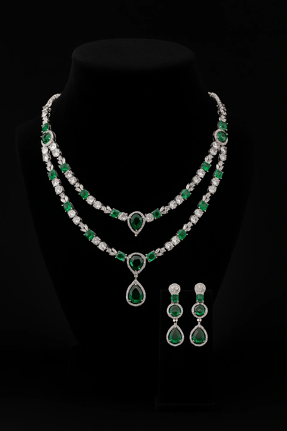 Every emerald gleams like a story of timeless class, wrapped in silver brilliance that turns every glance into admiration.