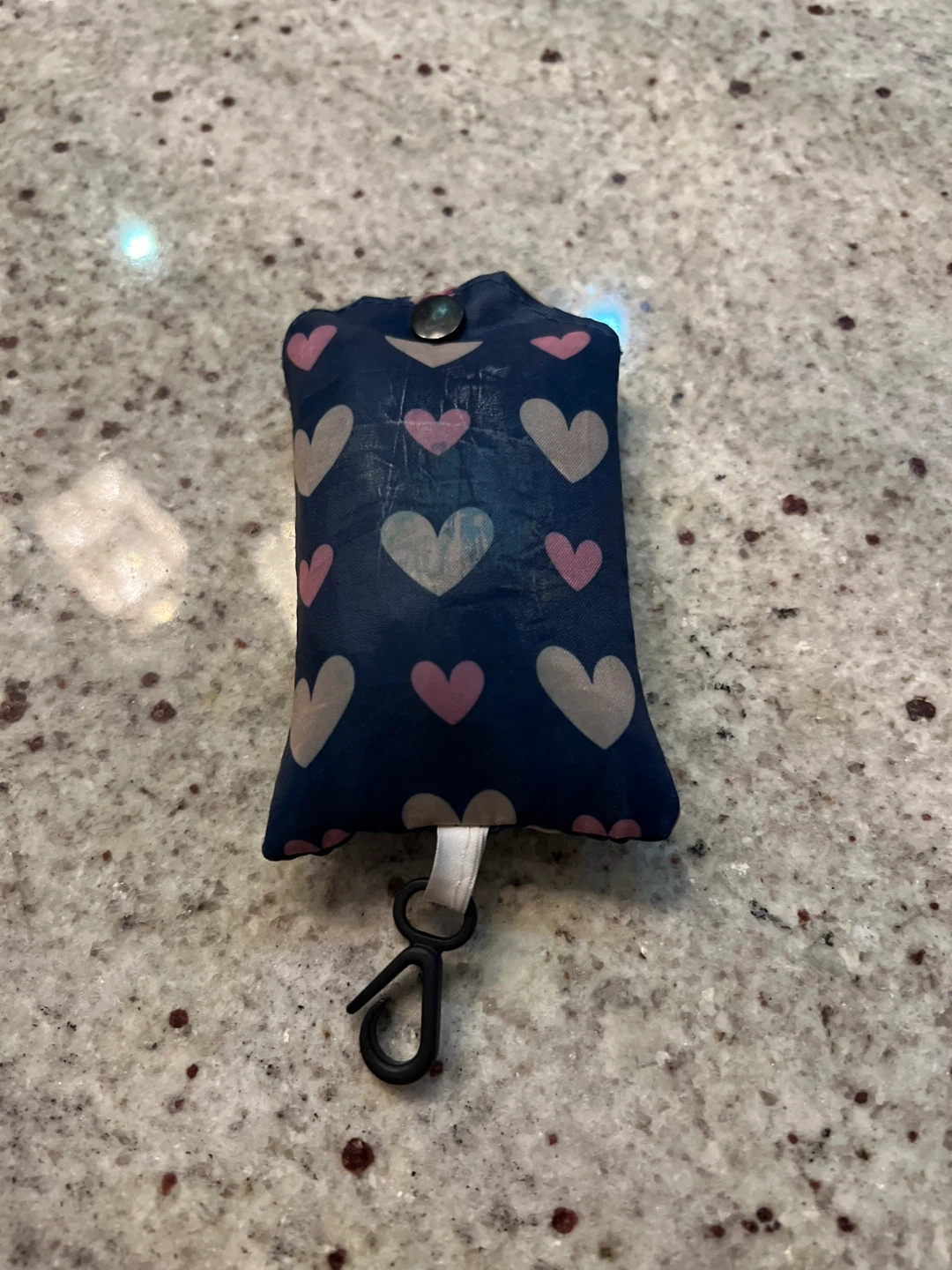 128This is a reusable shopping bag featuring a cute heart pattern! It's a convenient and eco-friendly way to carry your groceries or other items. It folds up for easy storage and has a clip to attach to your purse or keys
