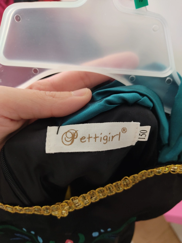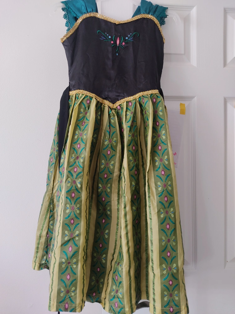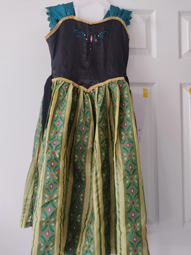 Selling a cute Pettigirl dress, perfect for your little one! It's an Anna-inspired dress from 'Frozen', in size 150. The dress features a black bodice, teal accents, and a lovely green and gold skirt with floral patterns. It's in great condition and ready for a new home!