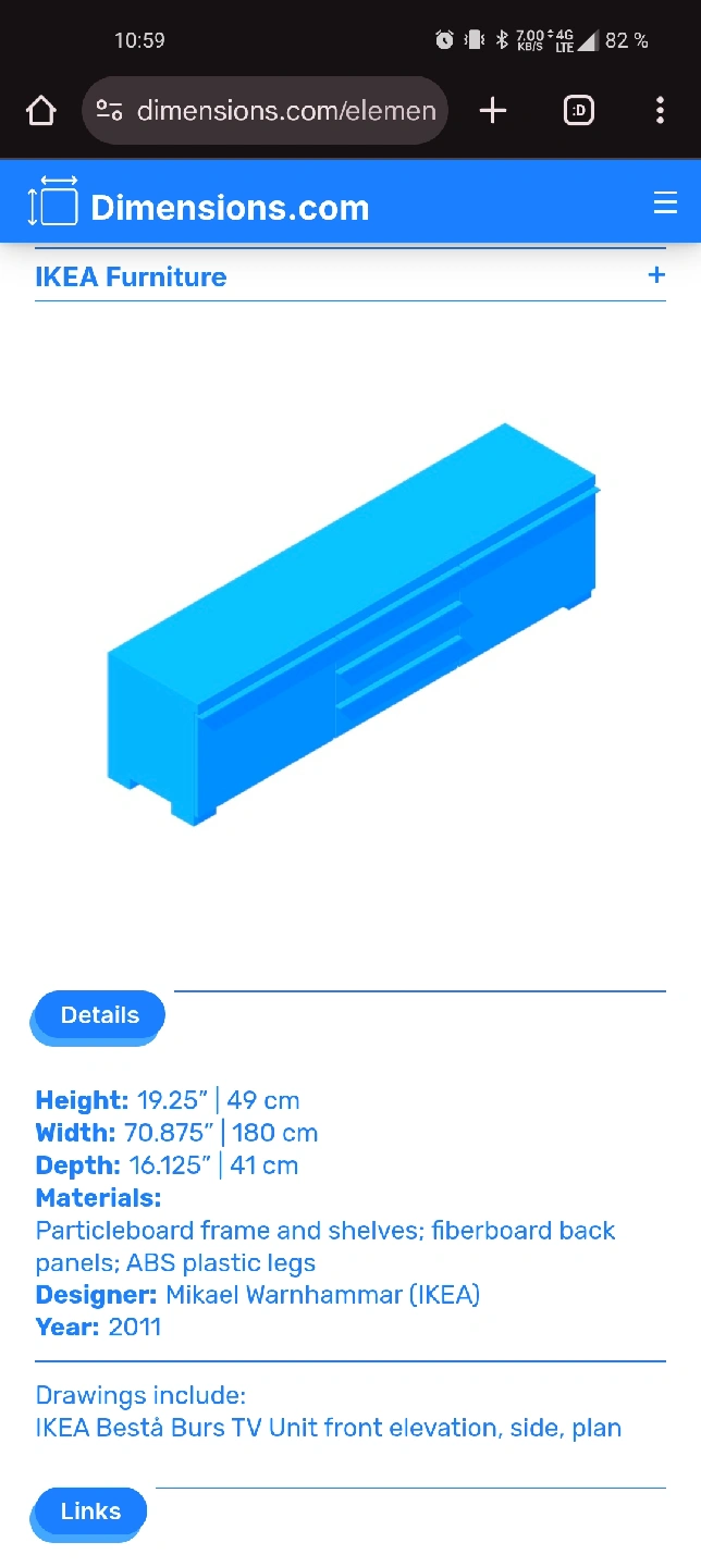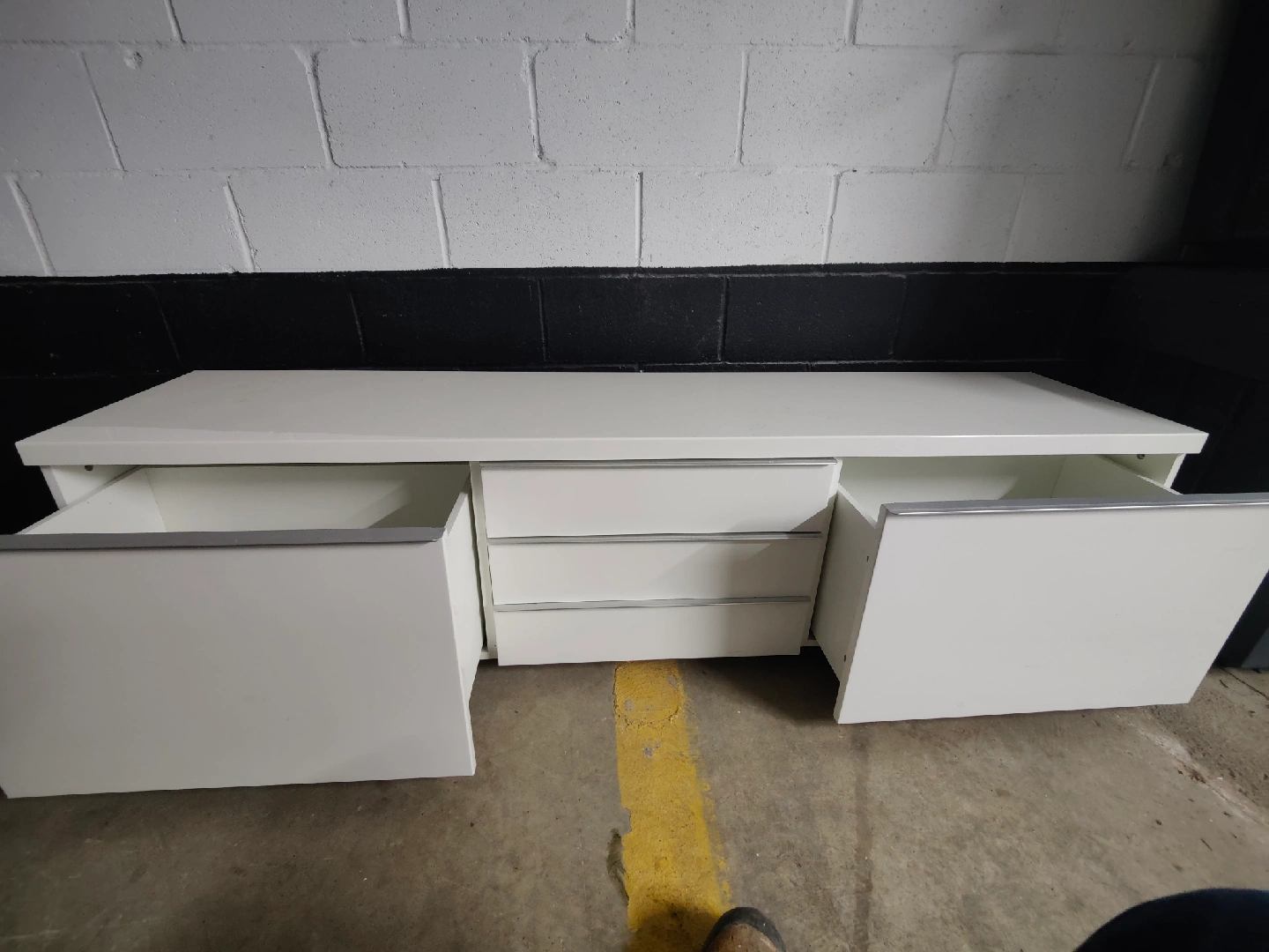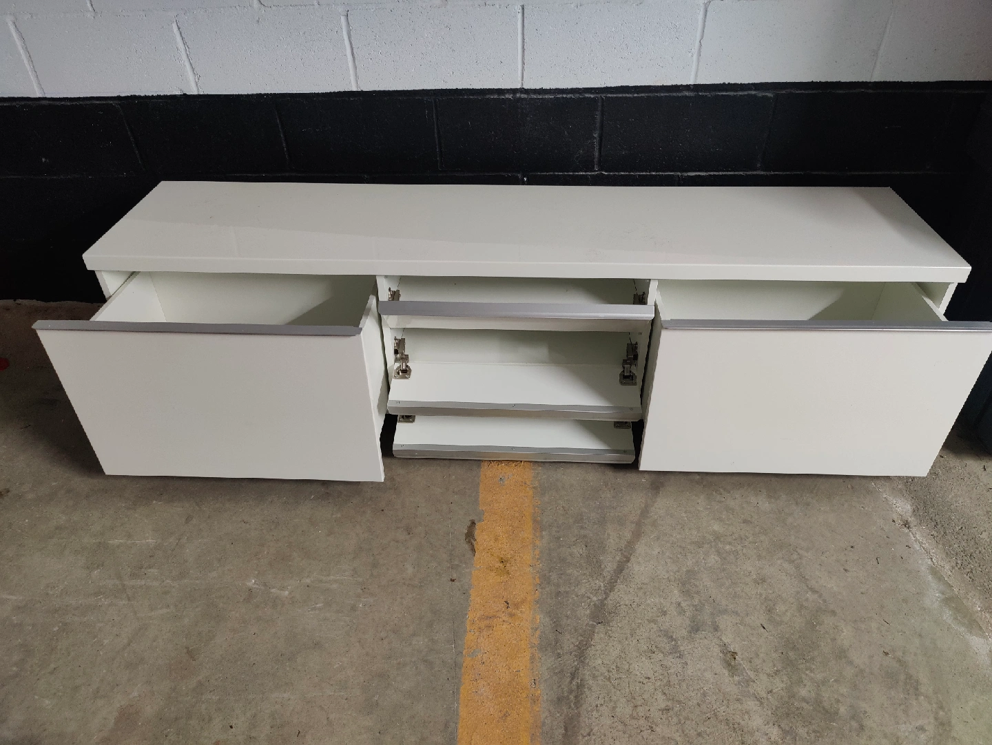 Selling a white IKEA TV stand. It has a clean look and is in good condition. The dimensions are 180 cm (70 7/8") in length, 48.5 cm (19 1/8") in height, and 41 cm (16 1/8") in depth