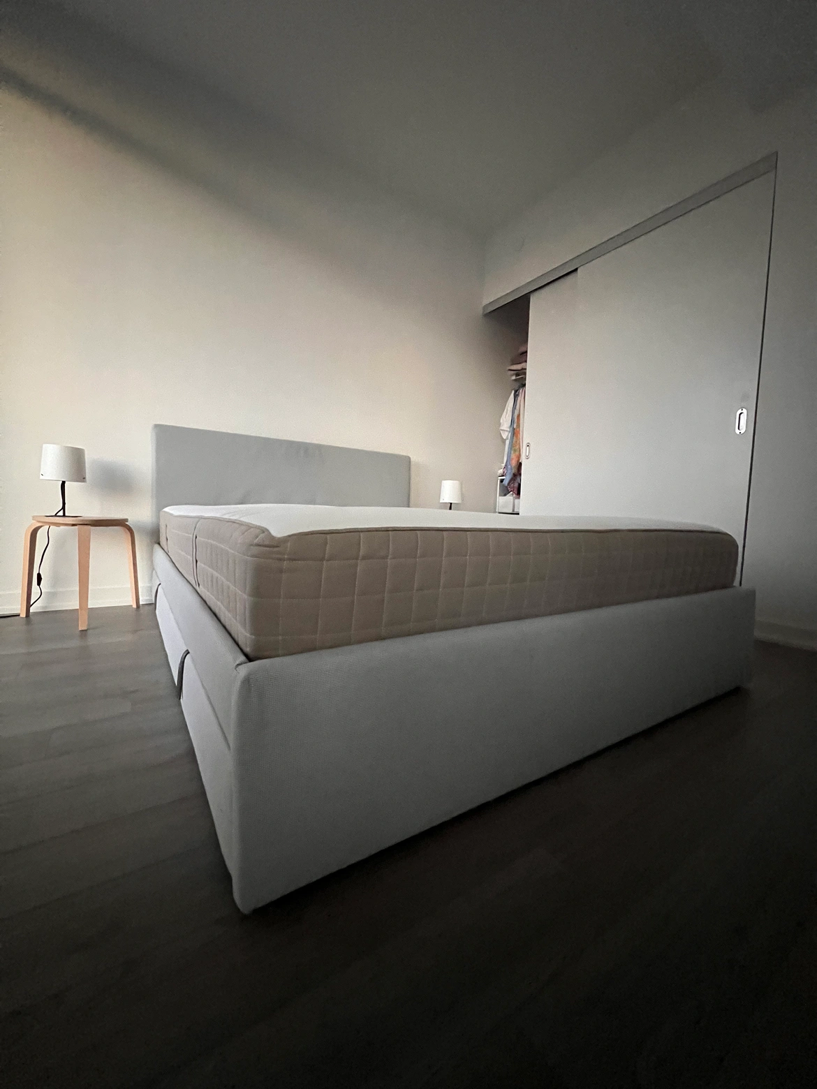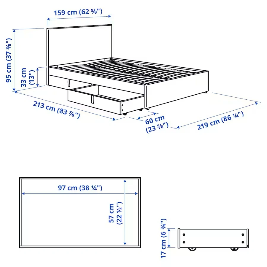 GLADSTAD upholstered bed frame with bed storage boxes has a clean and modern design with a padded headboard and soft cover. The storage boxes are easy to roll in under the bed – for practical storage.