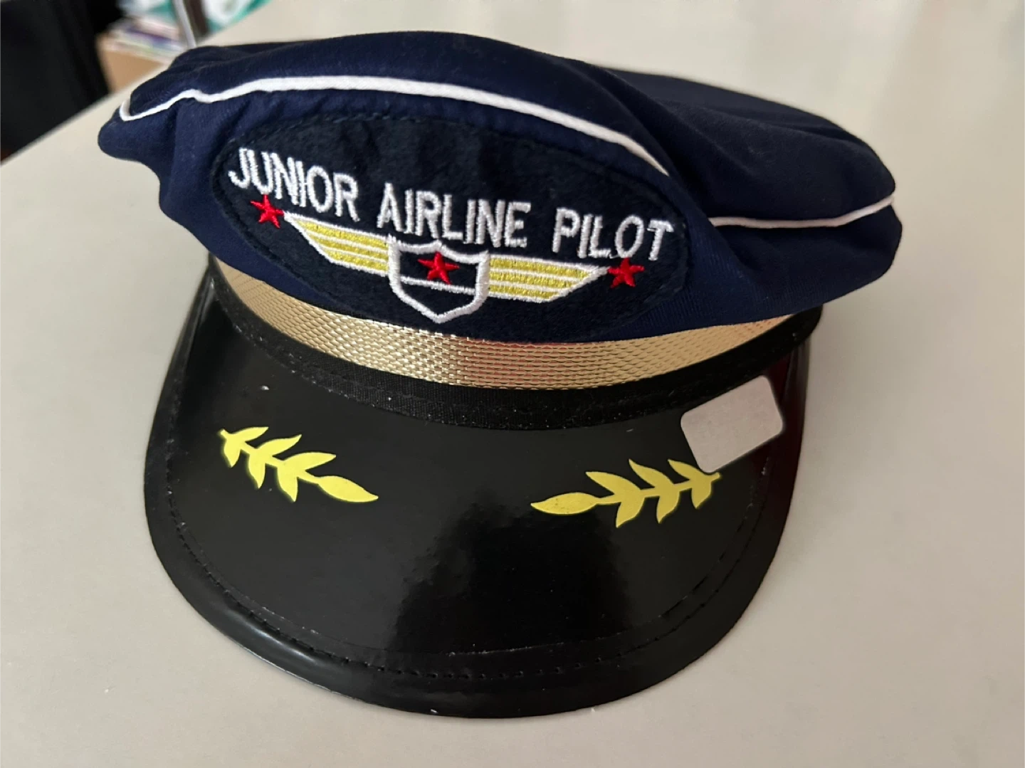 A fun Junior Airline Pilot hat! It's in great condition and ready for a new adventurer. The hat is made of 100% cotton and is size 54cm