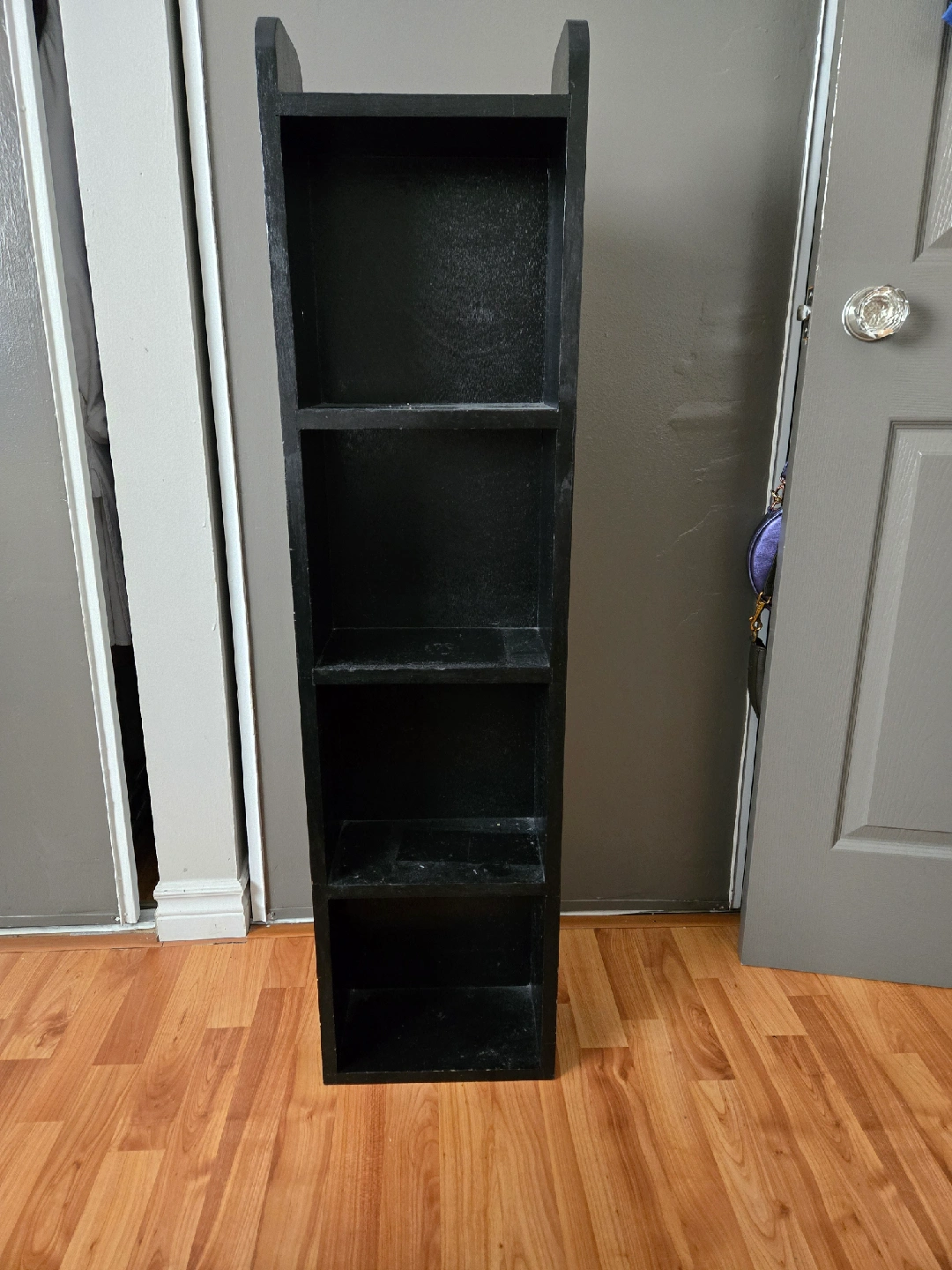 Here's a black wooden shelf unit, perfect for adding some storage to a small space! It has four shelves and is in good condition. Great for books, plants, or decorative items