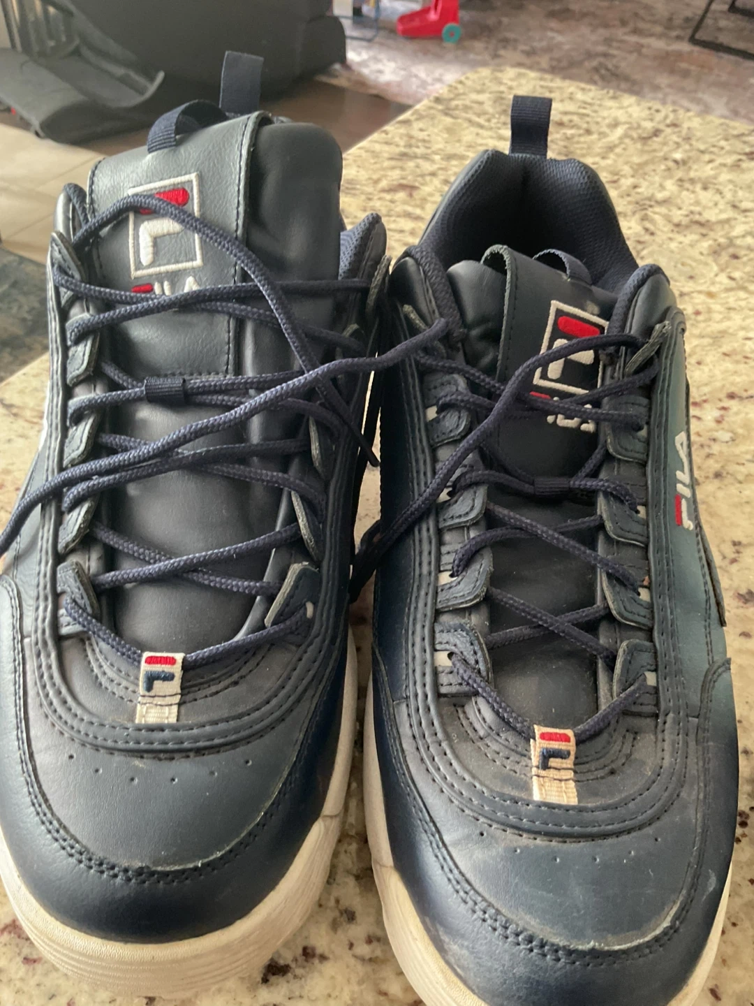 Selling a pair of Fila Disruptor shoes. They're in used condition, as you can see from the photos. Still lots of life left in them!