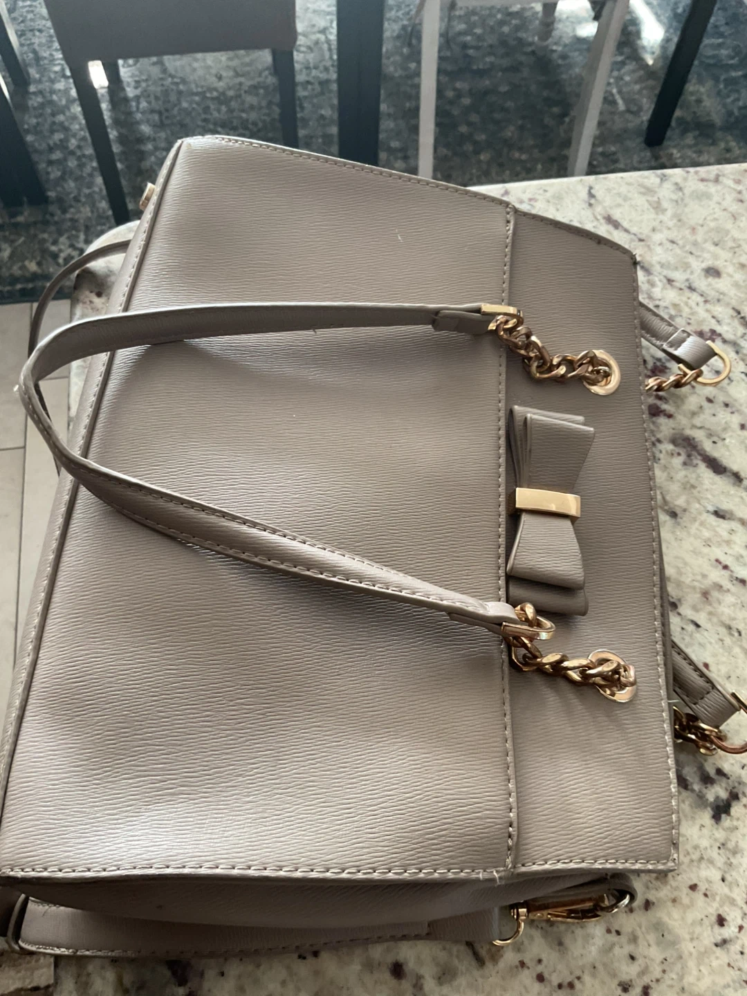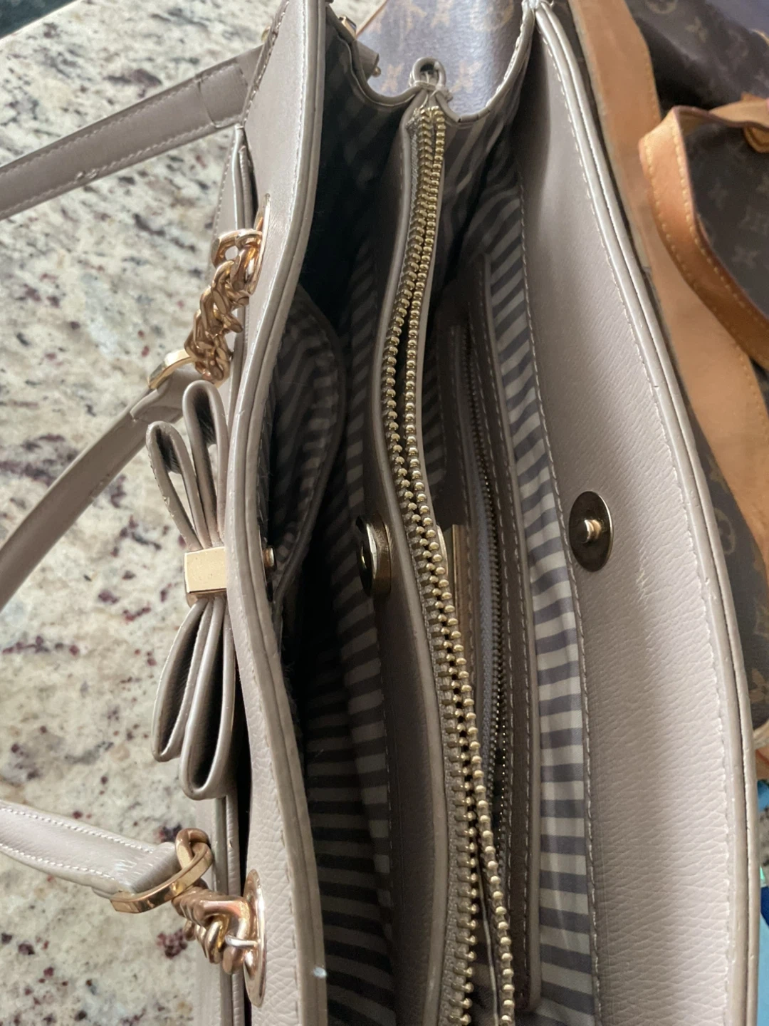 Selling a lovely beige tote bag. It features gold chain detailing and a cute bow accent. The interior has a striped lining and multiple compartments for organization. It's in great condition and ready for a new home!