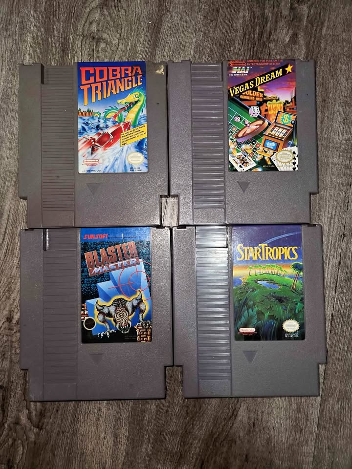 Selling 4 original Nintendo Entertainment System (NES) games โ€” all tested and working. Great additions for any retro collection! Included: ๐ŸŽฎ Blaster Master โ€“ $25 ๐ŸŽฎ Cobra Triangle โ€“ $20 ๐ŸŽฎ StarTropics โ€“ $20 ๐ŸŽฎ Vegas Dream โ€“ $10 โœ… Authentic Nintendo cartridges โœ… Clean pins, no reproduction labels โœ… Stored in a smoke-free home $50 for the bundle or priced individually above.