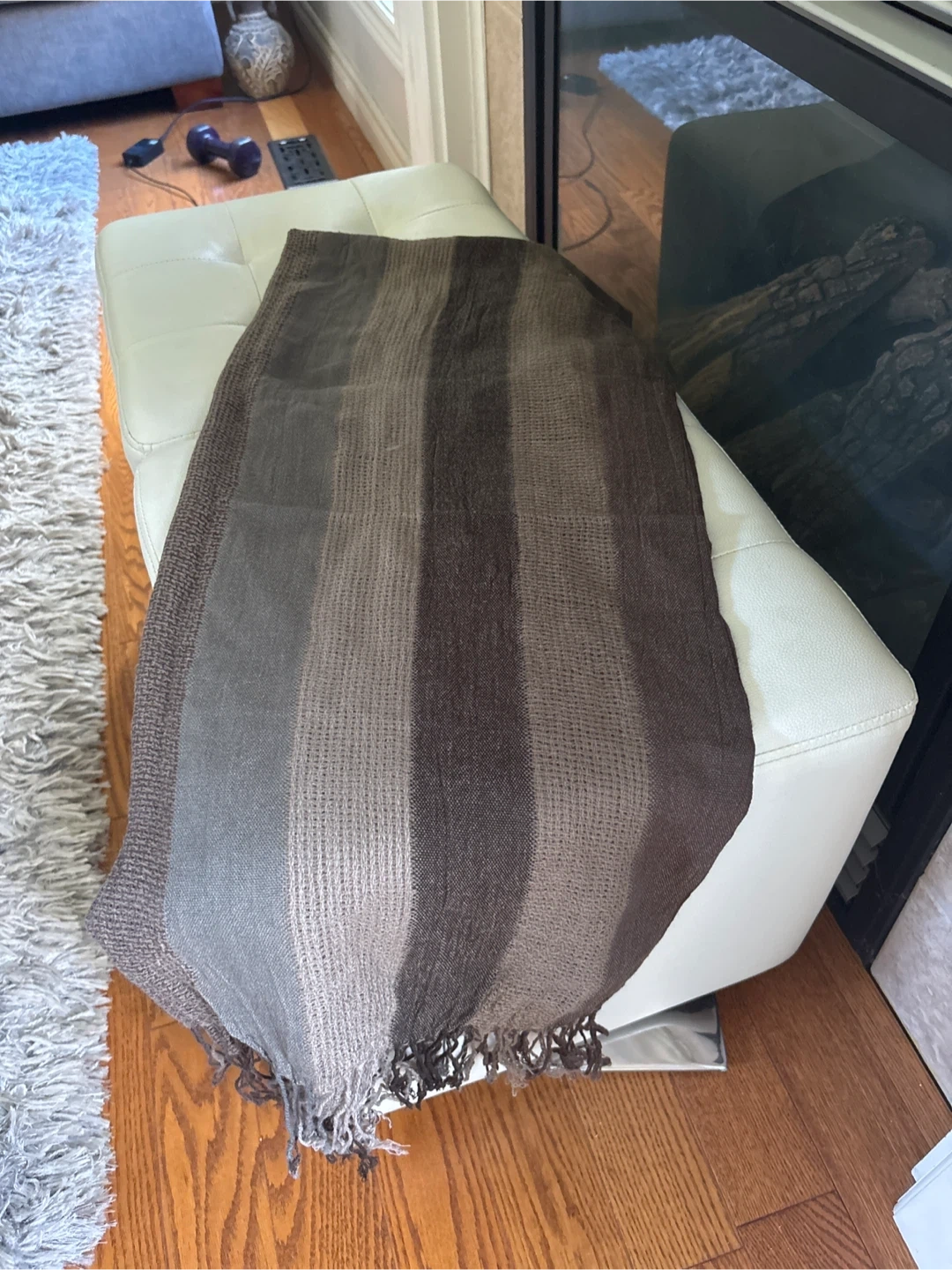 Cozy RW&CO. scarf in a lovely brown striped pattern! Made of 100% acrylic, it's perfect for adding a touch of warmth and style to any outfit. The fringe detailing adds a nice touch!