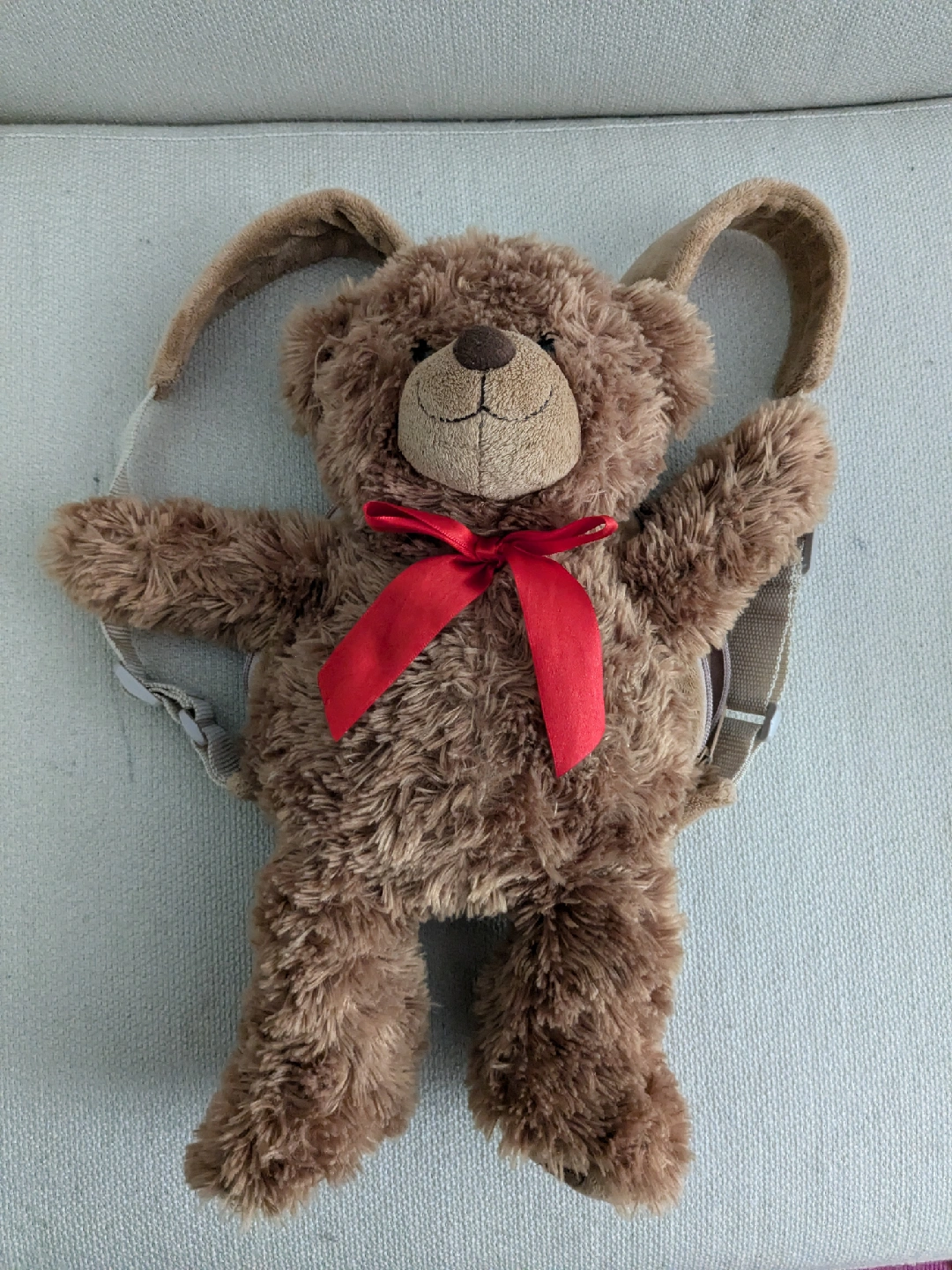 This cute brown teddy bear doubles as a backpack! It's in great condition and perfect for little ones. Perfect for carrying small toys or snacks!