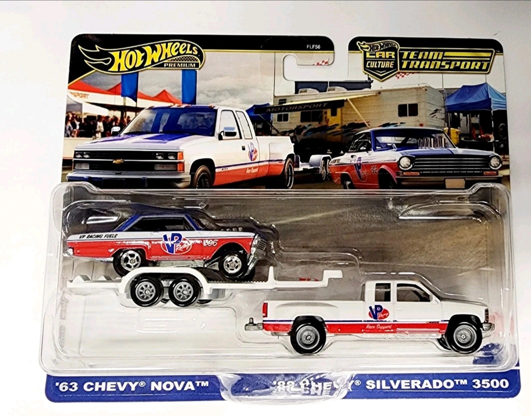 26Hot Wheels Premium Car Culture Team Transport featuring a '63 Chevy Nova and '88 Chevy Silverado 3500. Great for collectors or kids!