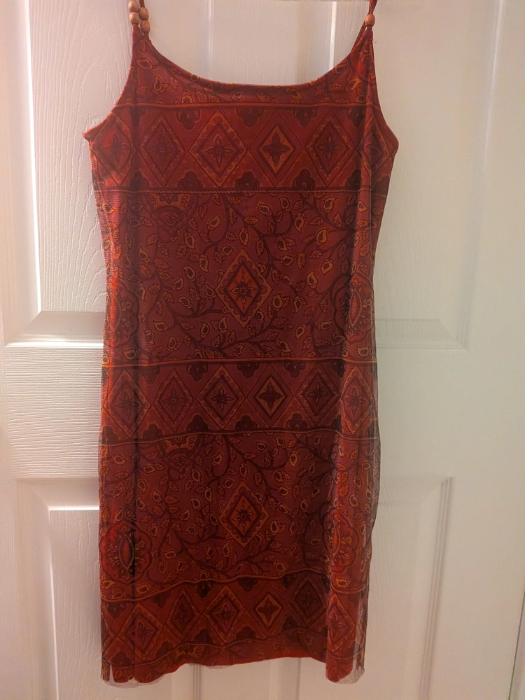 This is a cute orange dress with a unique pattern. It's perfect for a casual day out or a summer evening. The dress is in good condition and has adjustable straps.