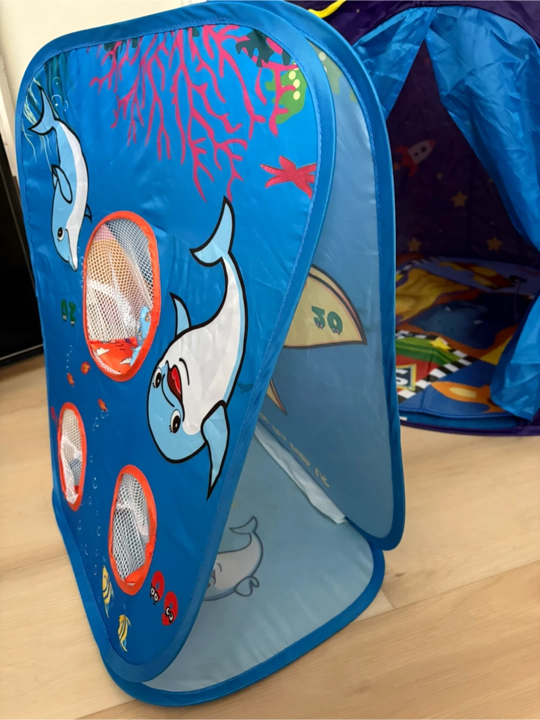 62I'm selling a Yomful pop-up play tent in blue! It comes with bean bags for added fun. The tent features a cute dolphin and ocean theme, making it perfect for kids. It's in good condition and ready for a new home