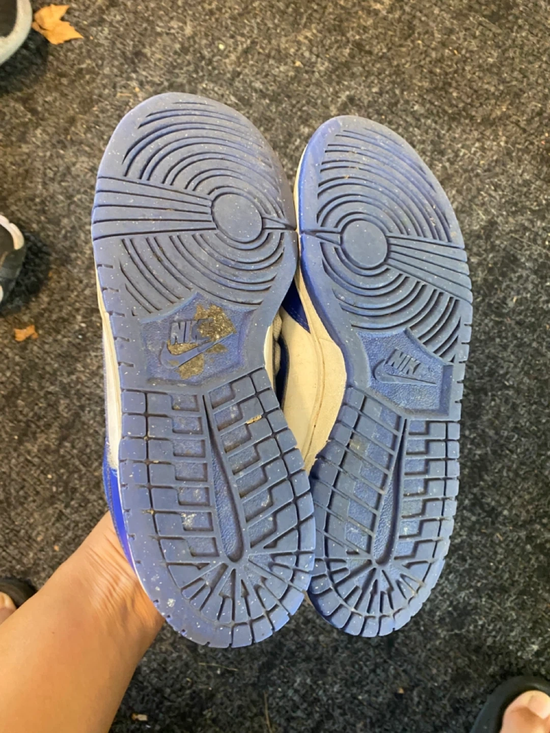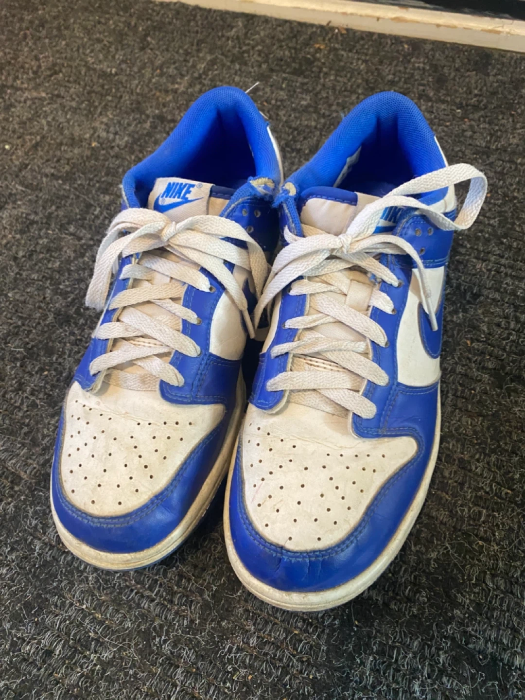 Selling a pair of Nike Dunk Lows in white and royal blue! They're in used condition, as you can see in the photos, but still have lots of life left. The size is US 6Y.