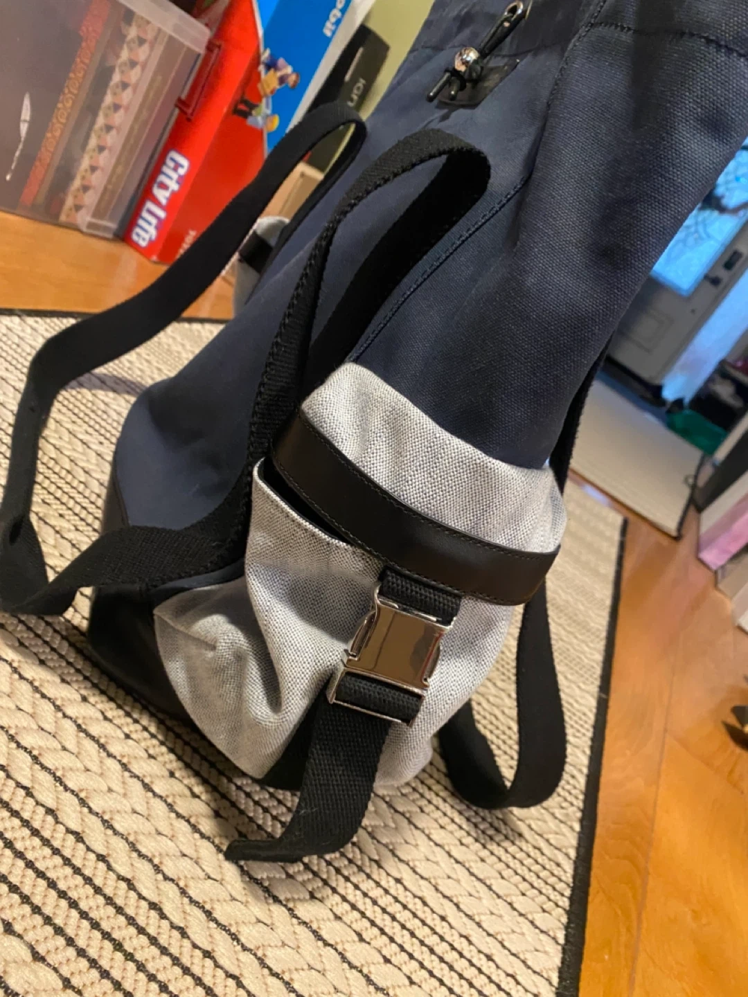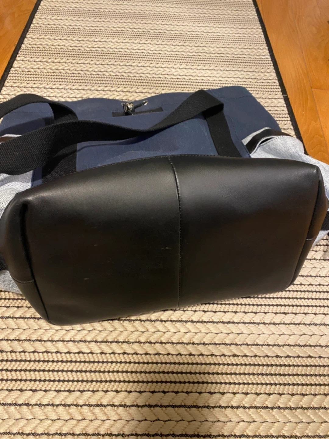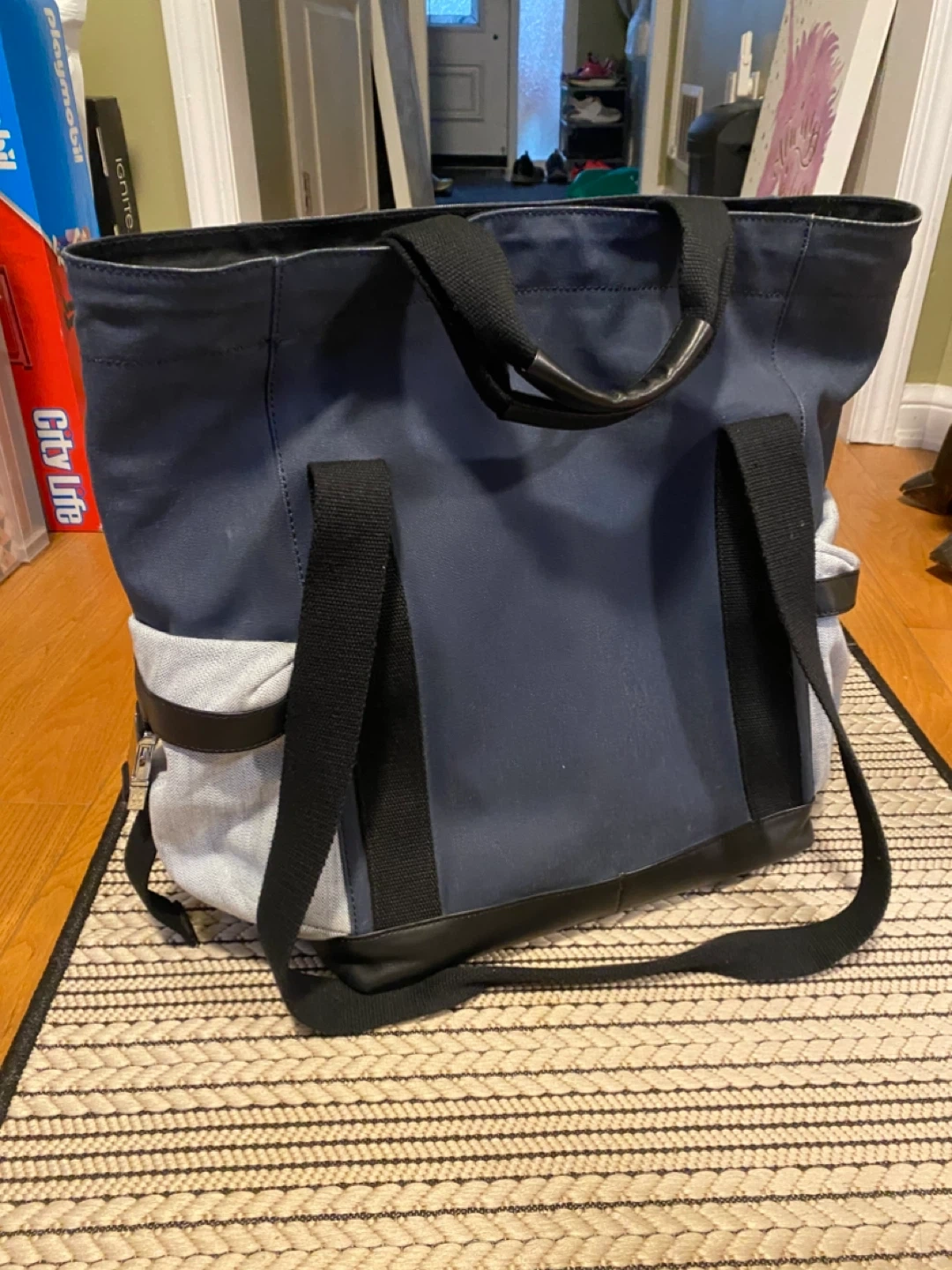 60This is a WANT Les Essentiels tote bag in a stylish blue and grey colour combination. It's a great size for everyday use or travel. The bag features black leather accents and durable canvas material. It has both shoulder straps and a longer adjustable strap for versatile carrying options