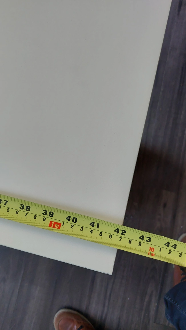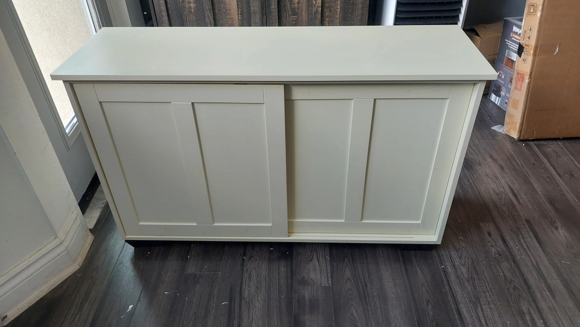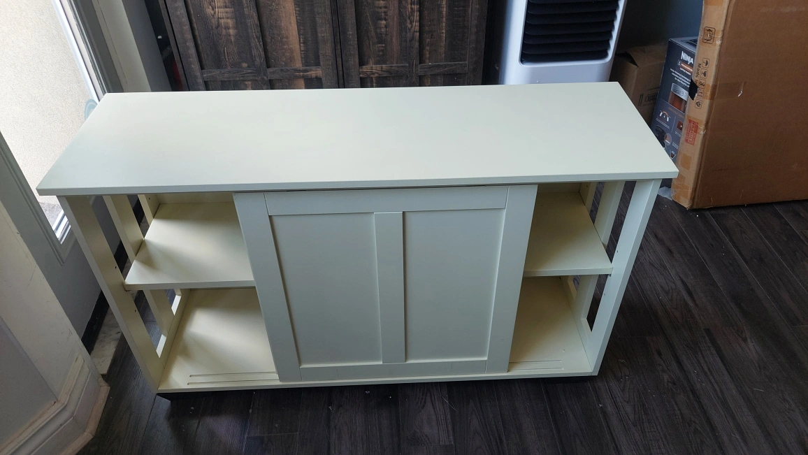 Selling a cabinet in off-white with sliding doors. It features shelves on the sides for extra storage. The top measures approximately 43 inches in length and 13 inches in width.