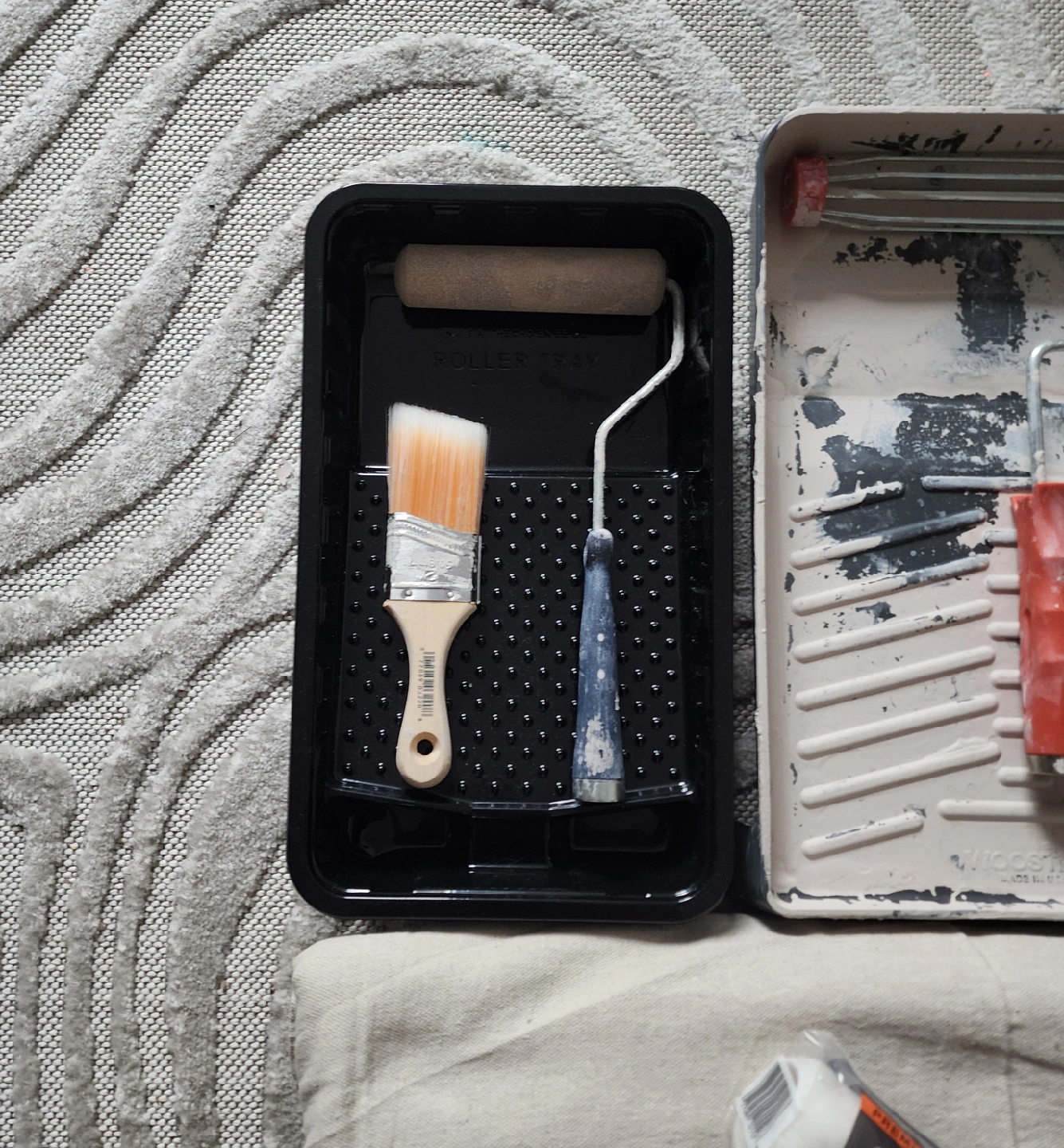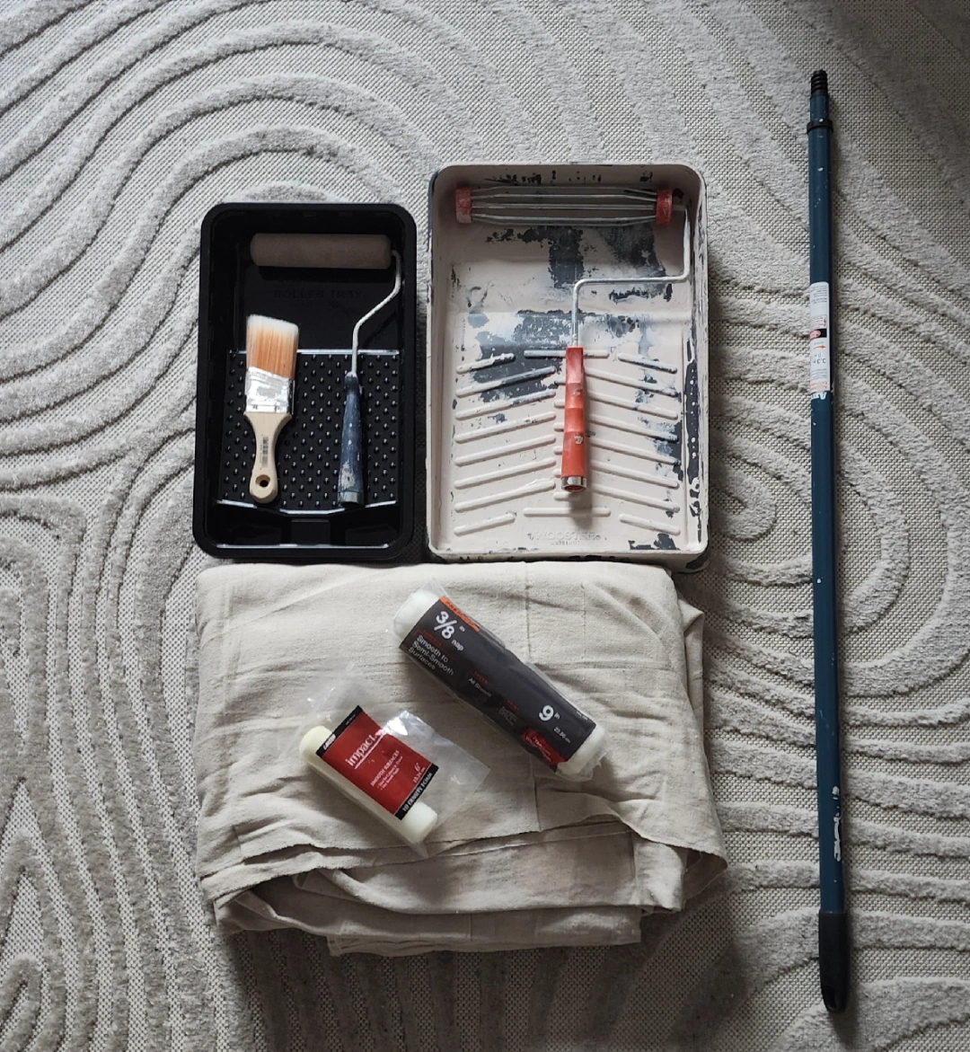 Giving away a set of painting supplies including small and large paint rollers, a brush, small and large tray, and an extension pole and heavy duty drop cloth. Perfect for your next wall painting project!