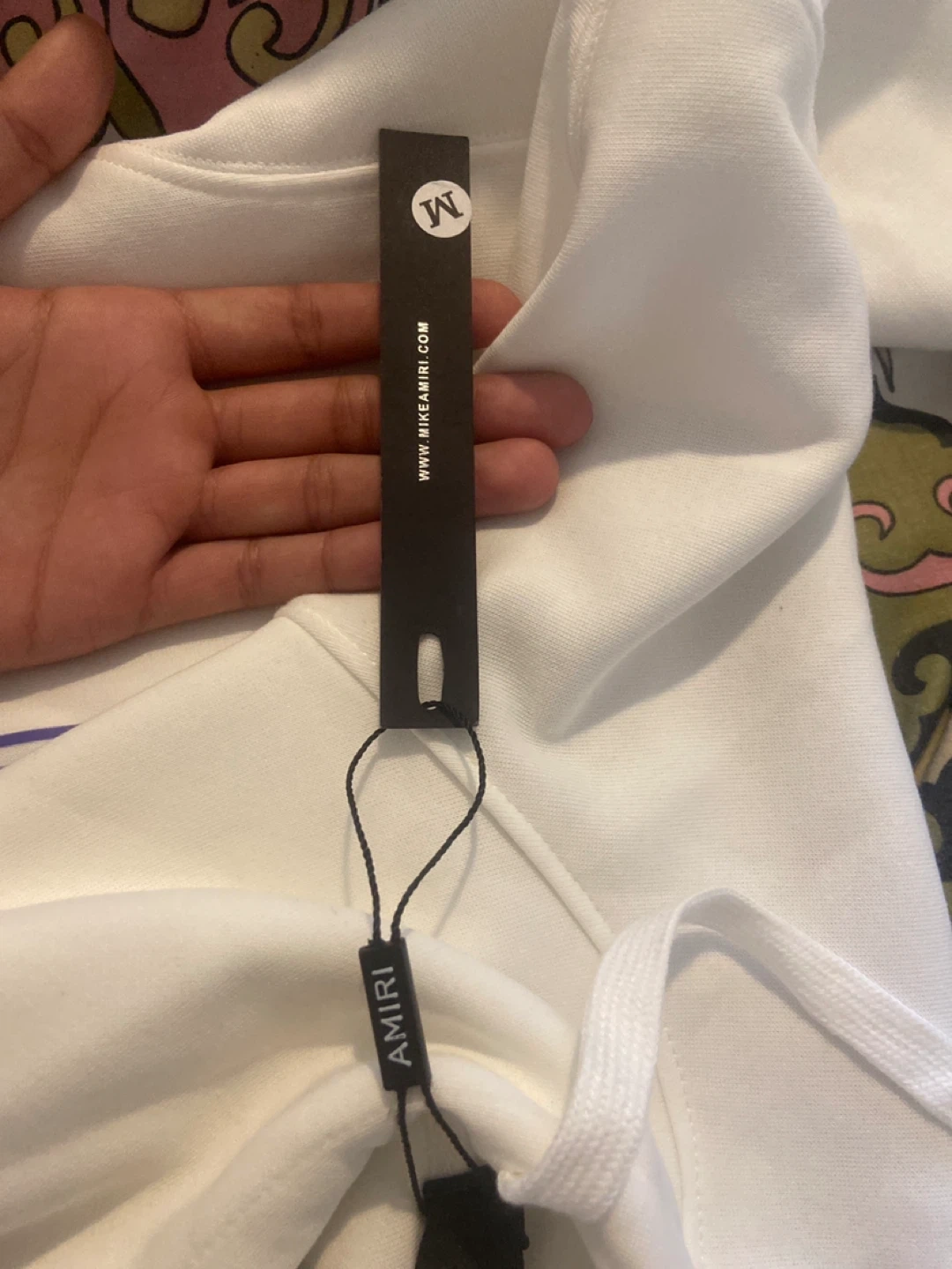 Selling a stylish Amiri hoodie in a clean white colour. It features the iconic Amiri drip paint design on both the front and back. The size is Medium. Perfect for adding a touch of designer flair to your wardrobe!
