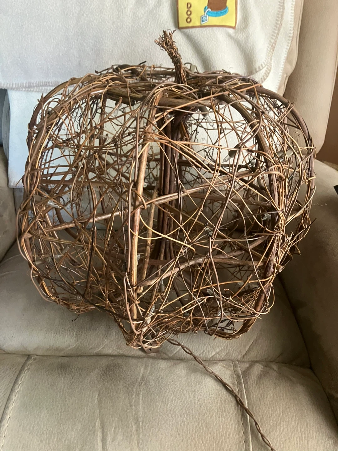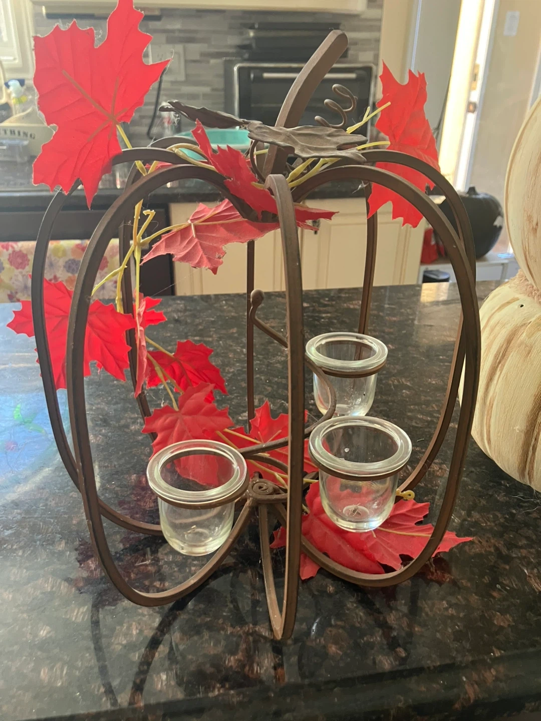 Metal pumpkin with 3 glasses for small candles, 14”x38 round.