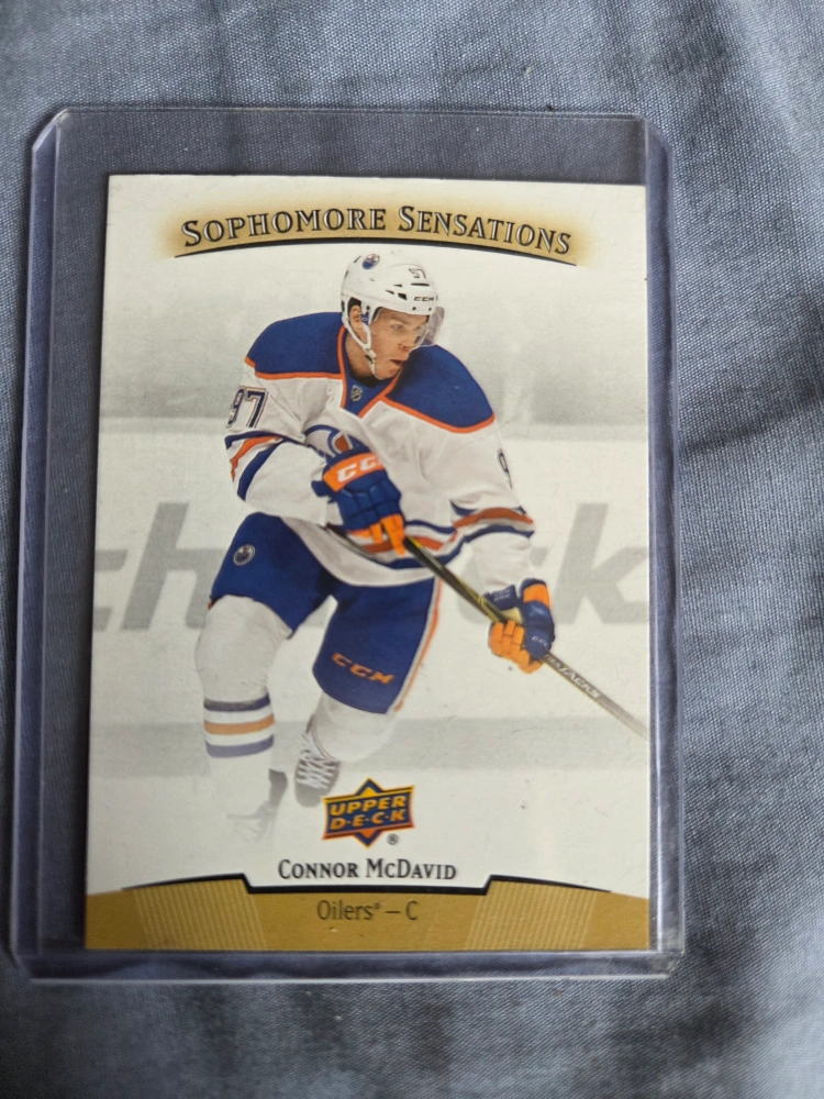 Selling a Connor McDavid Upper Deck hockey card from the Sophomore Sensations series! It's in great condition and would be a great addition to any hockey card collection