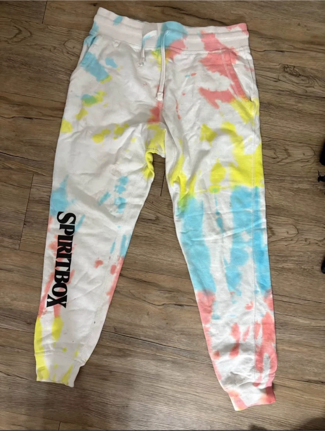 Selling a pair of Spiritbox tie dye sweatpants! They're in great condition and super comfy. The tie dye pattern features a mix of blue, yellow, and pink. The brand name is printed down the side of one leg.