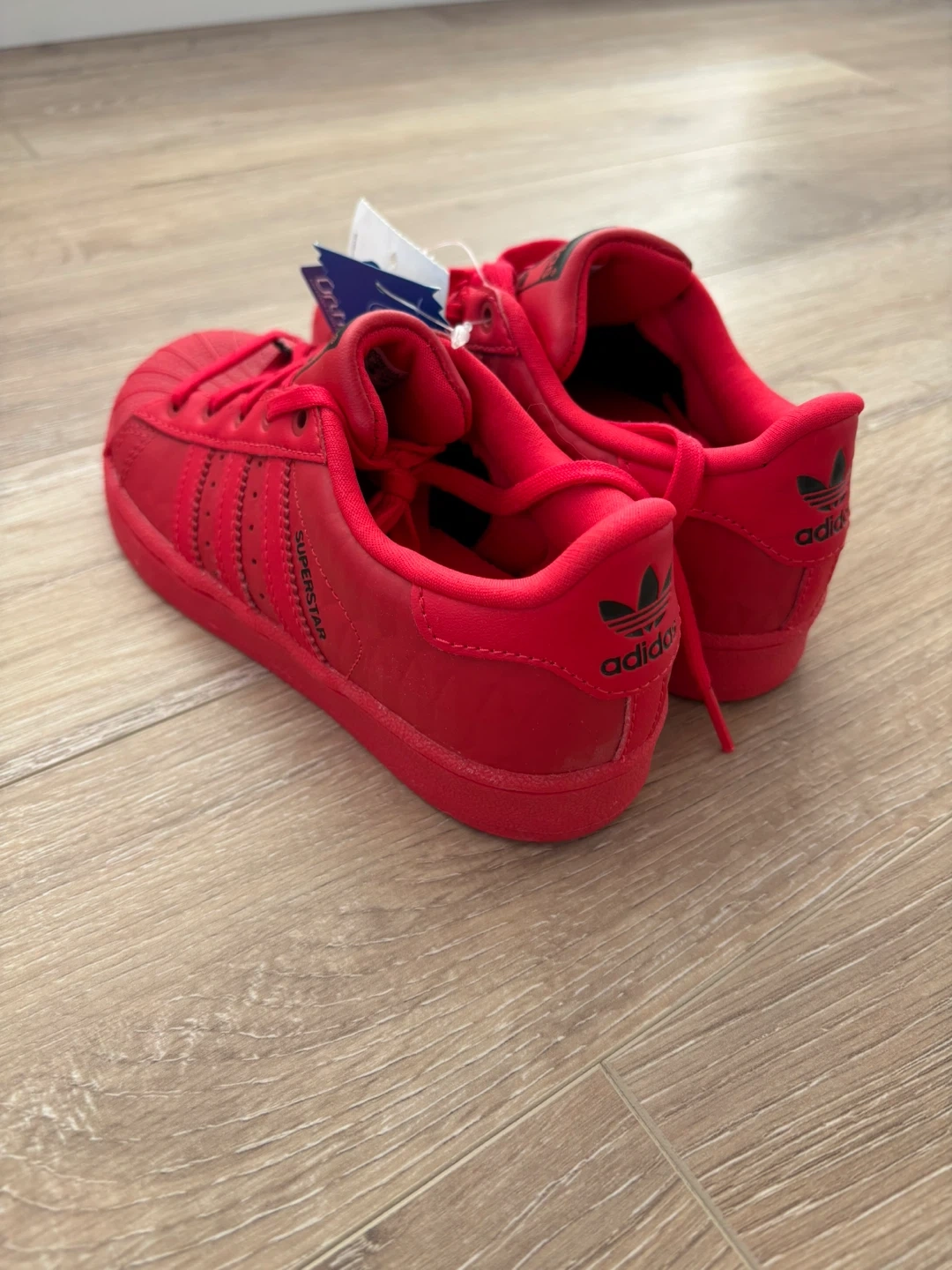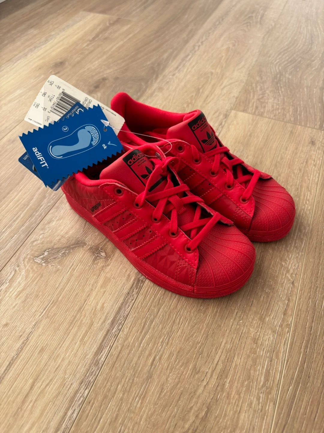 Adidas Superstar sneakers in red, youth size 12K. They feature Ortholite insoles and adiFIT technology for a comfortable fit. These are classic shoes and super cute. Brand new with tags.