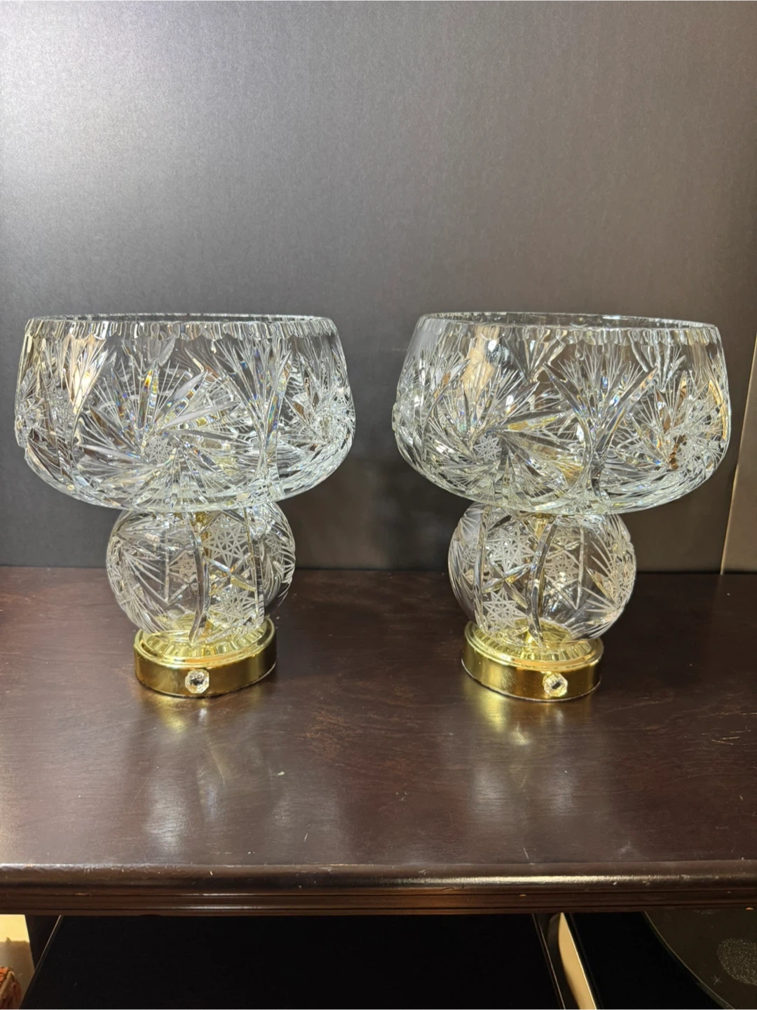 Selling a pair of beautiful crystal bowl.They have a lovely, intricate design.These would add a touch of elegance to any room! High 9 inches, diameter 7 inches