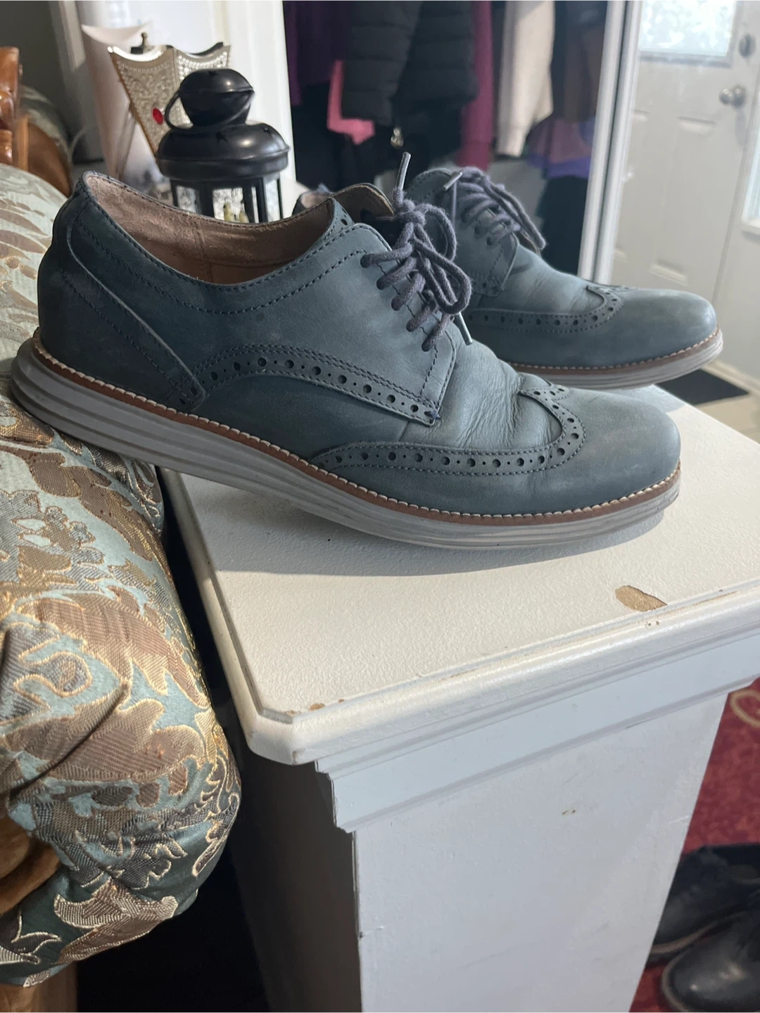 These are a pair of Cole Haan dress shoes in a blue leather. They are a wingtip style and have been gently used. A stylish addition to any wardrobe!