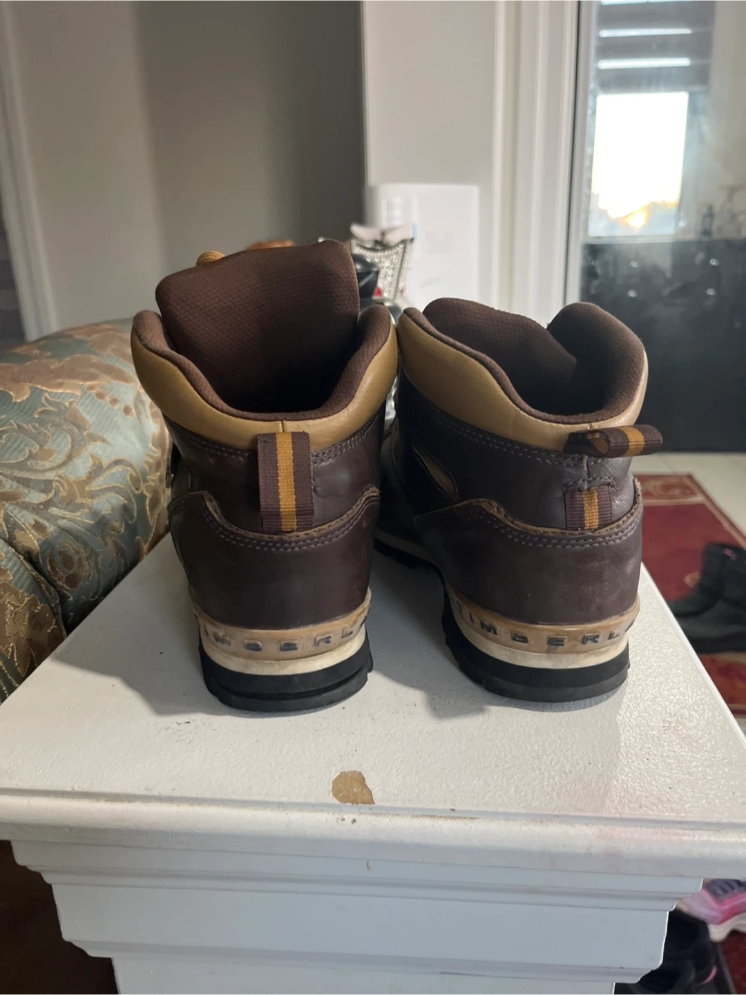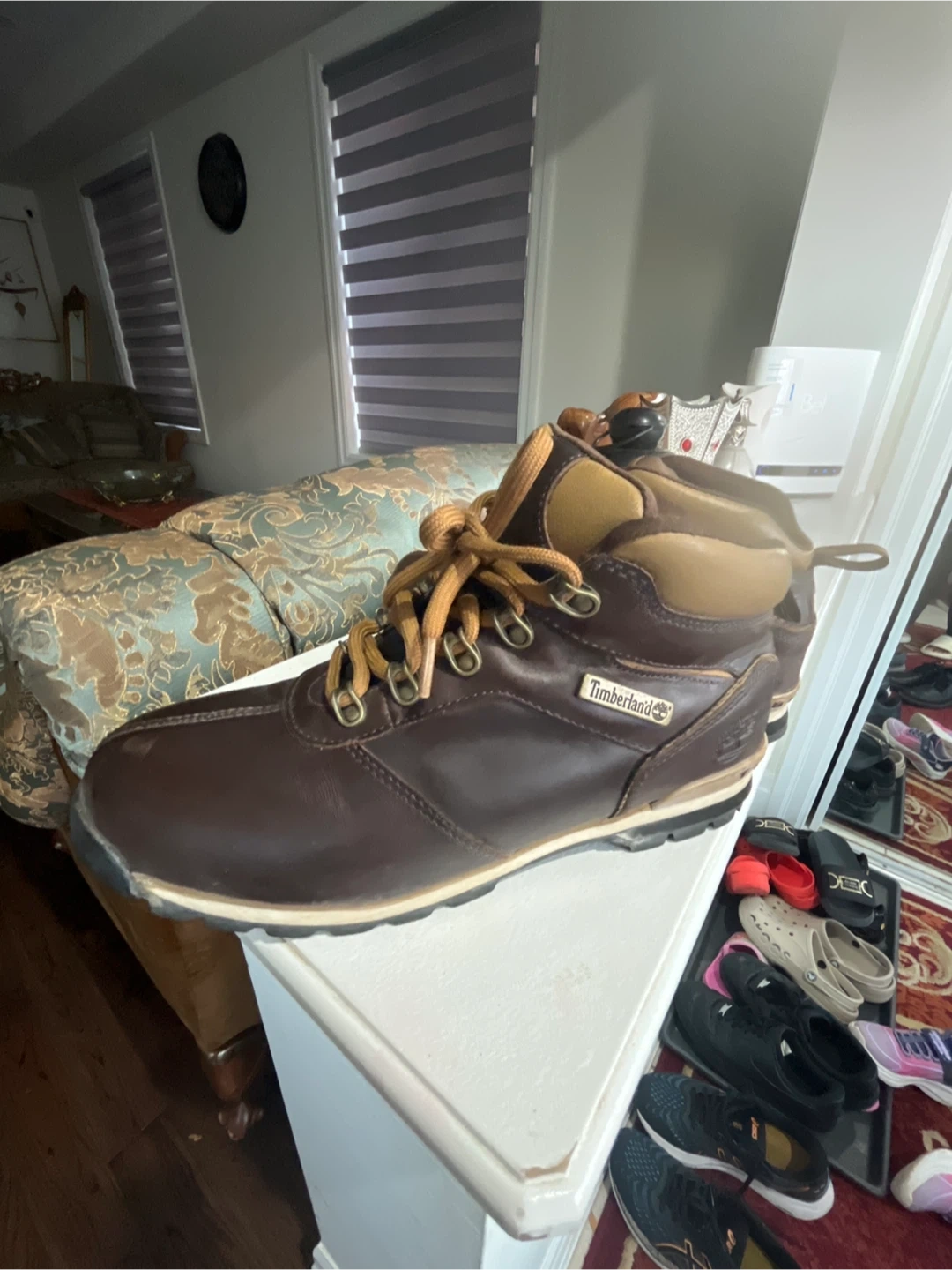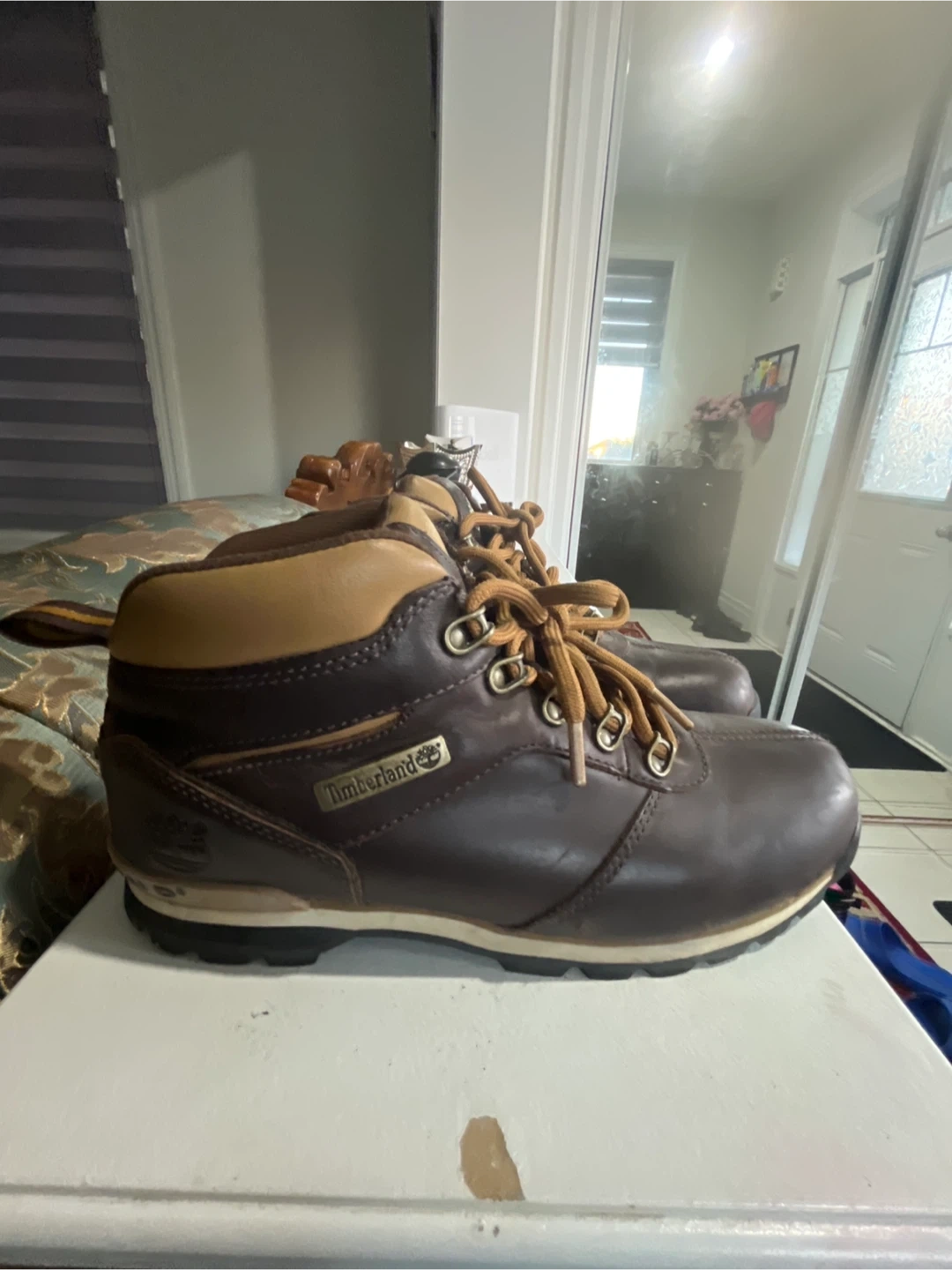 Selling a pair of Timberland Euro Hiker boots in brown leather! These are in good condition and ready for your next adventure. They are a classic style and great for hiking or everyday wear