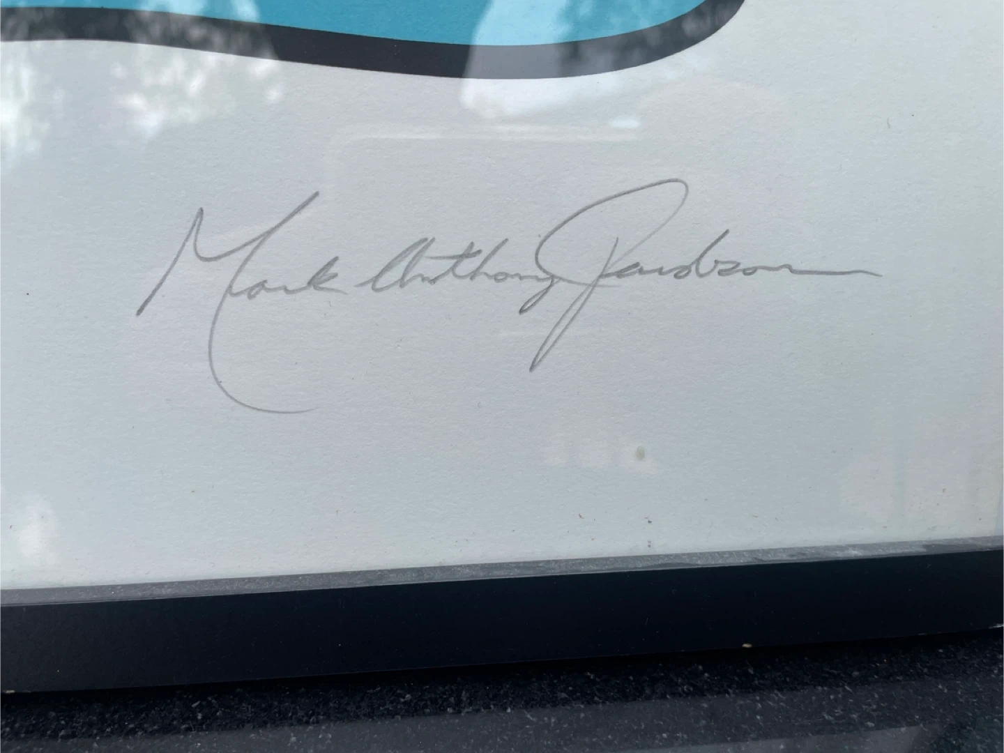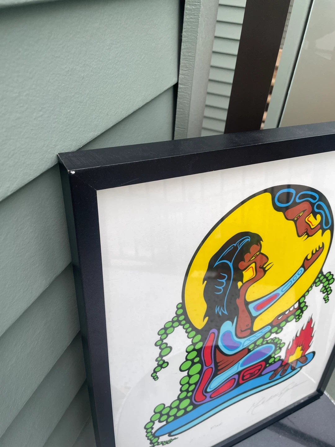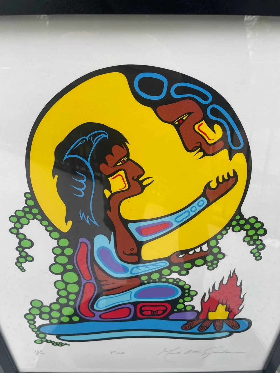 This is a framed art print by Mark Anthony Jacobson titled 'Fire'. It's a beautiful piece with vibrant colours and unique design. Indigenous art