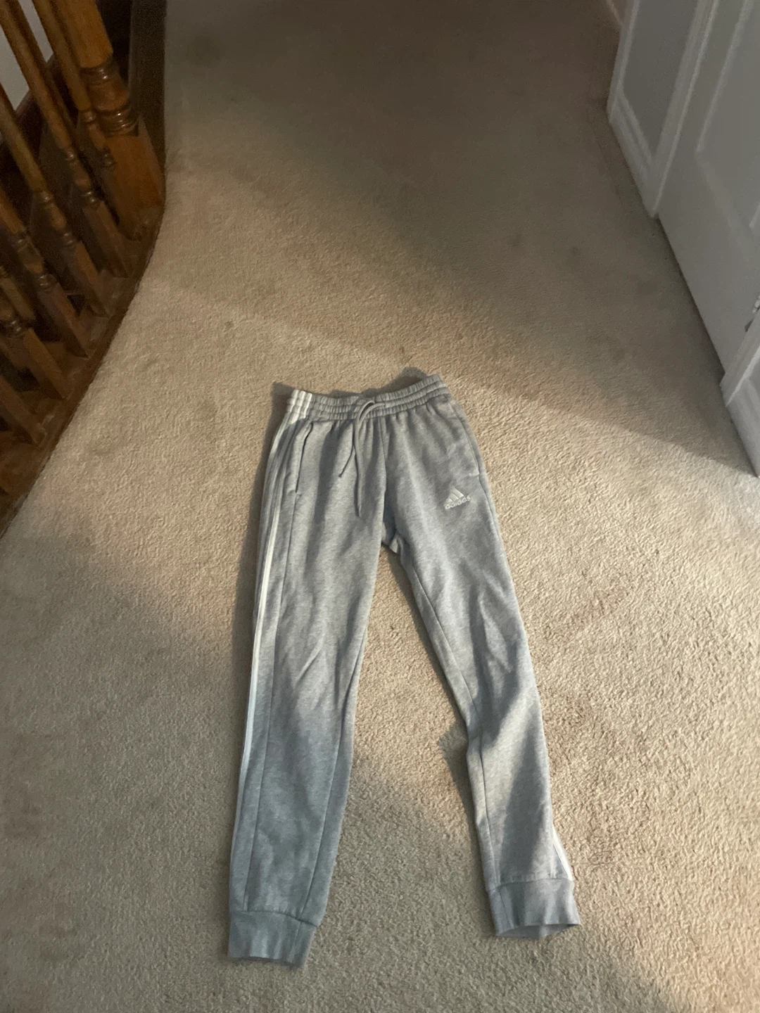 Selling a pair of grey Adidas joggers. They're in great condition and super comfy for lounging around or hitting the gym!