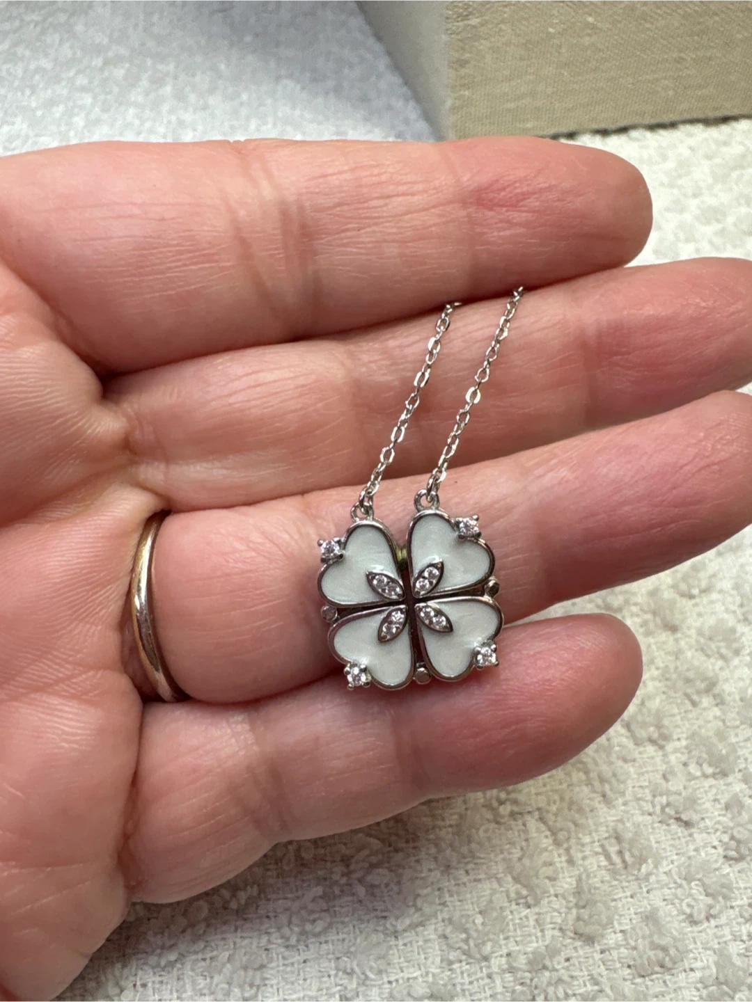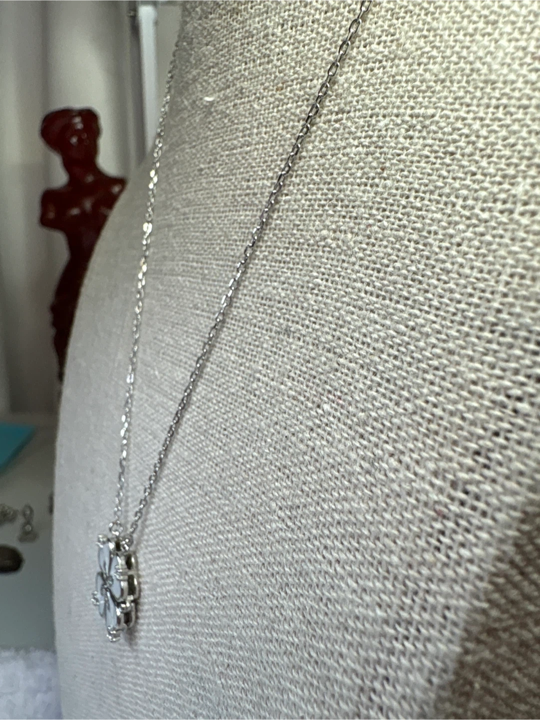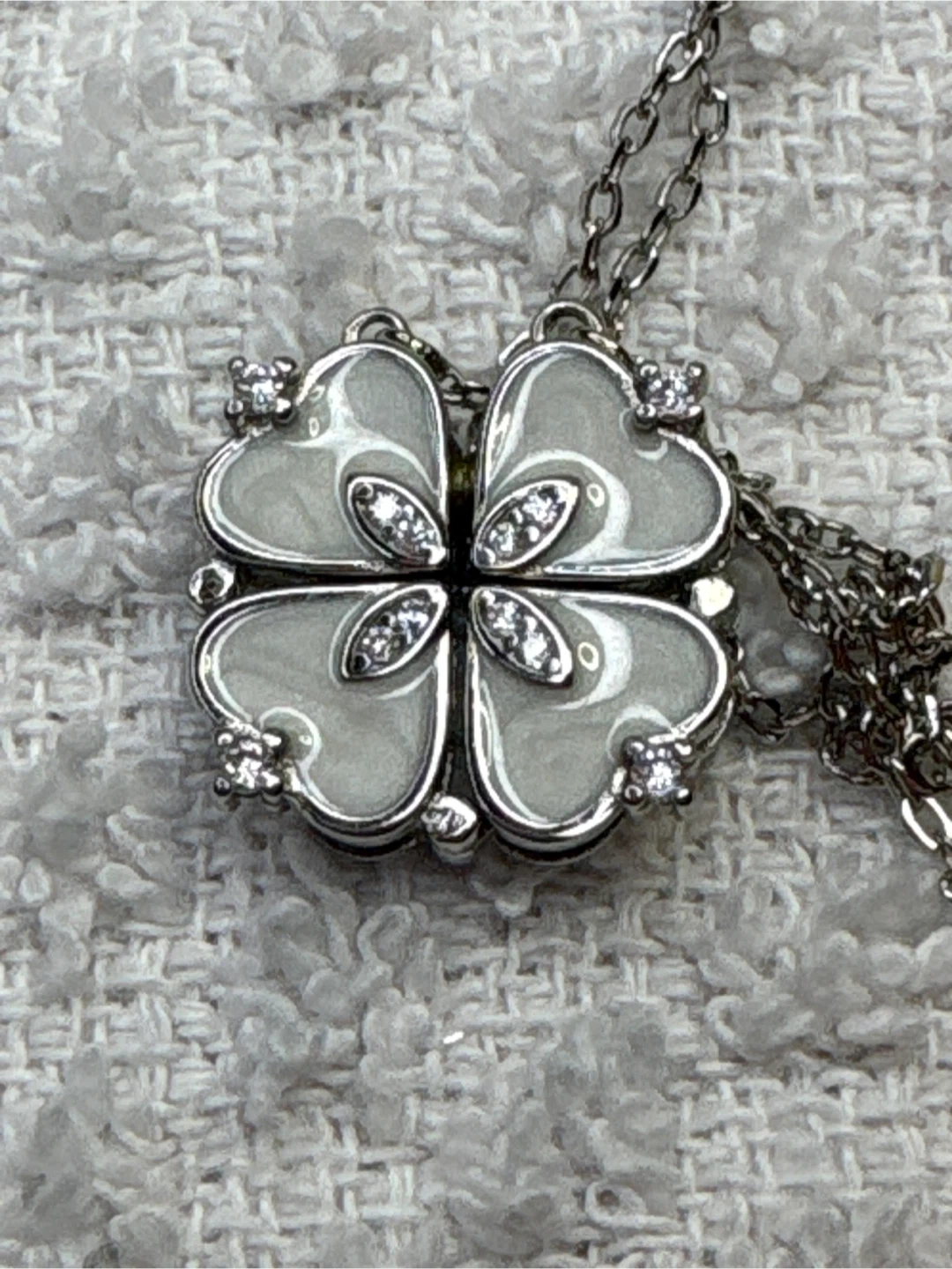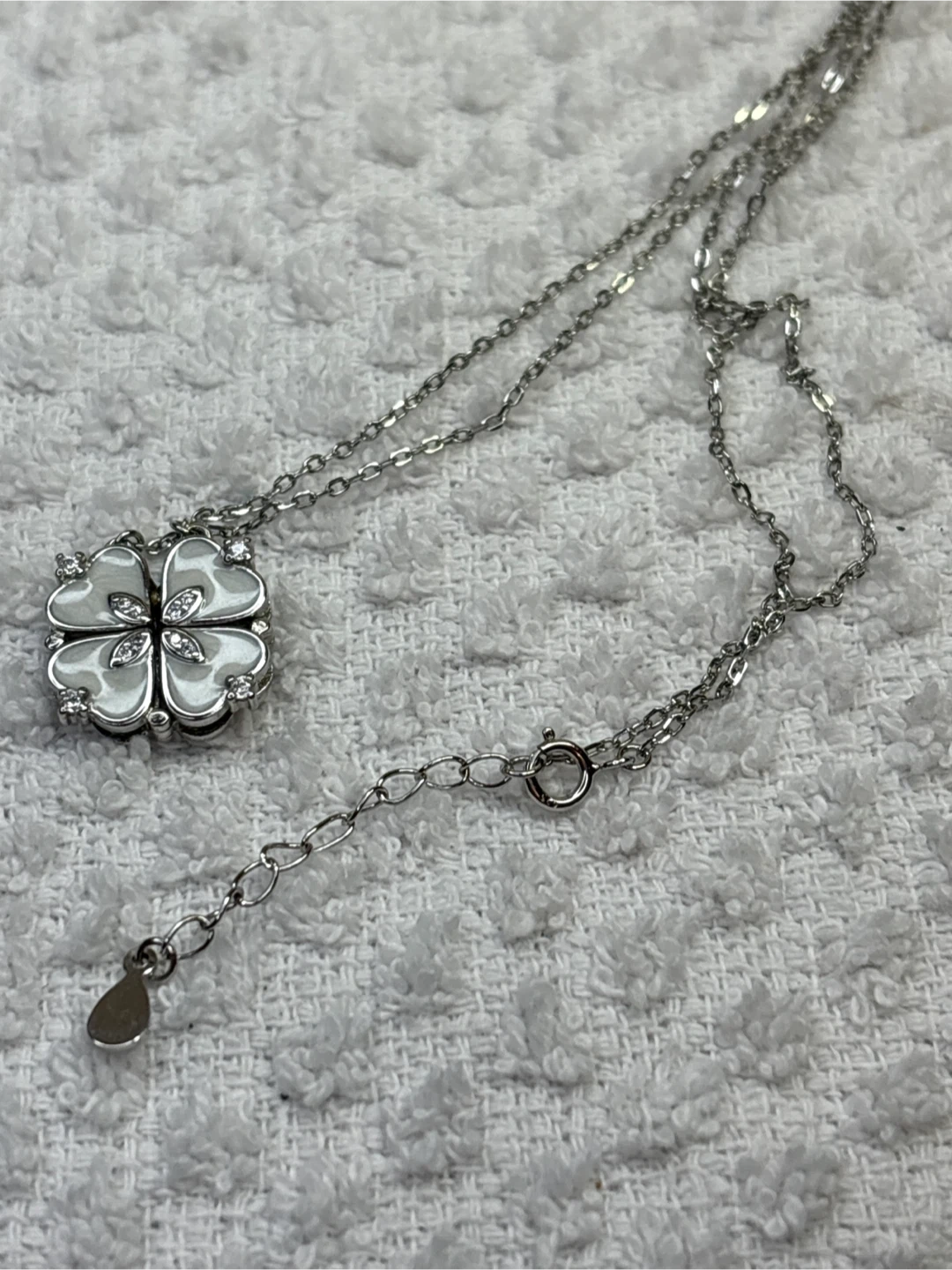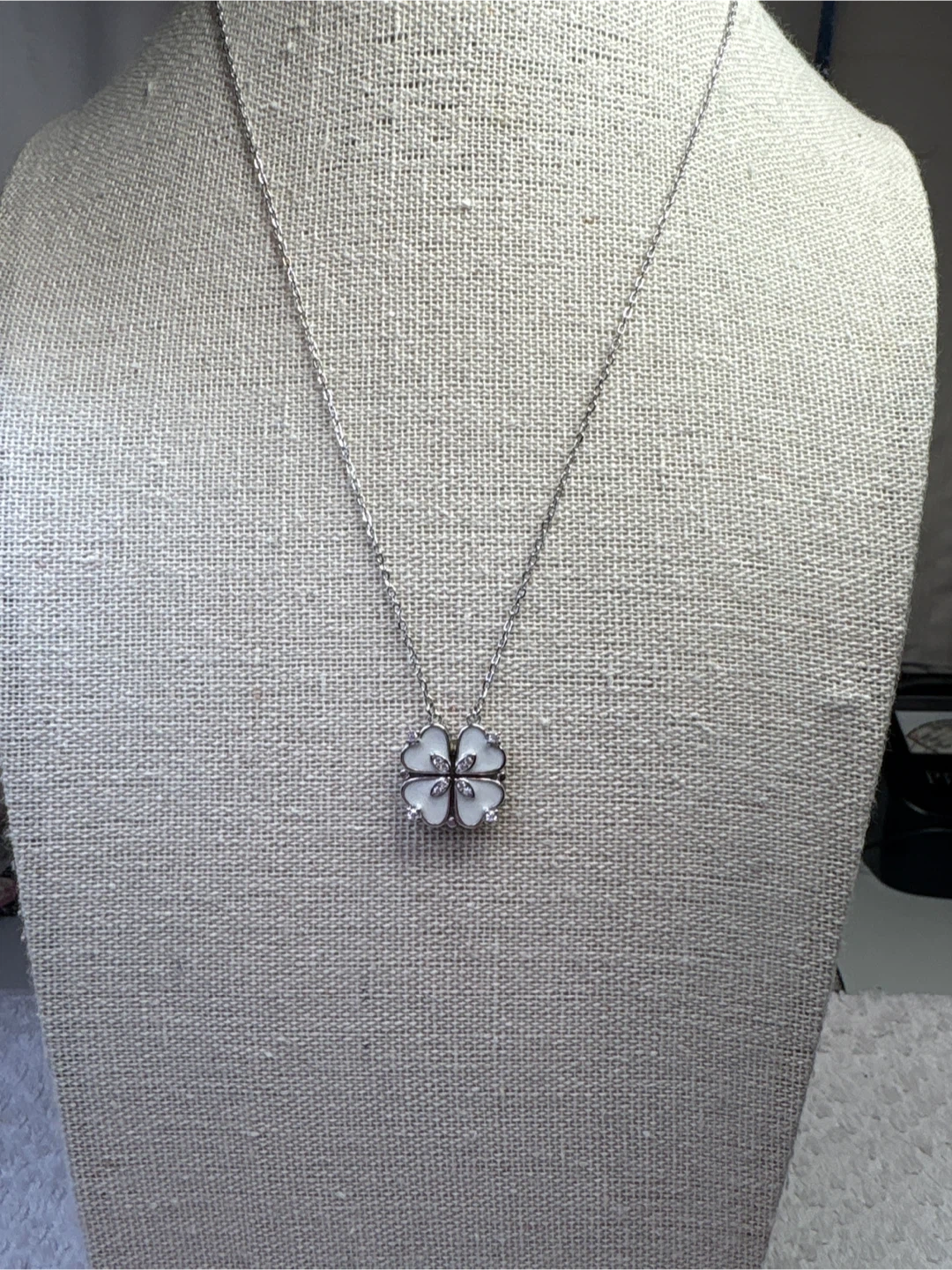 Here's a beautiful sterling silver four-leaf clover necklace! It has a delicate silver chain and a clover pendant with white enamel and sparkling cubic zirconia accents. It's in great condition and would make a lovely addition to your jewelry collection. 16 inch chain with one inch extender. Spring ring clasp.