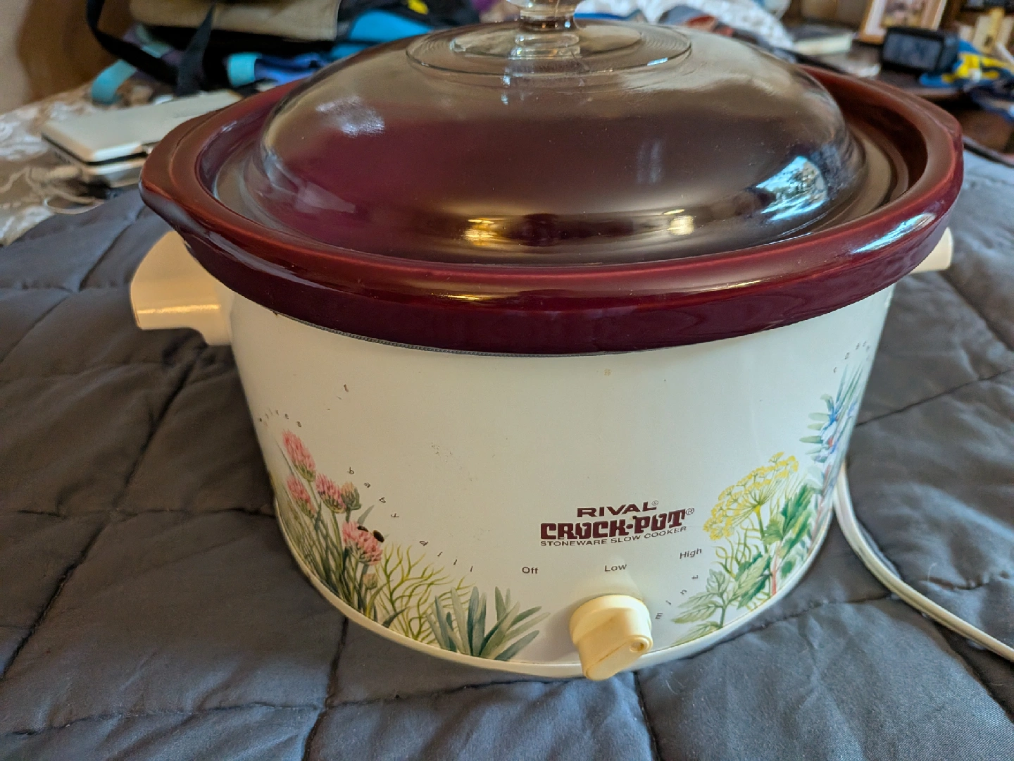 Selling a large Rival Crock-Pot stoneware slow cooker. It has a floral design and a high/low setting. It is in excellent condition and ready for your next stew!