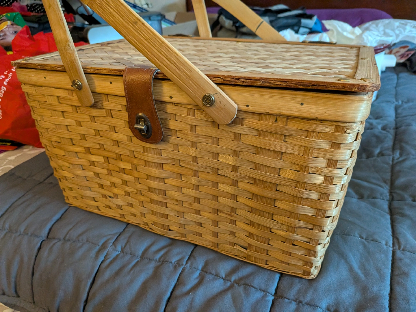 184Selling a picnic basket that comes with a set of colourful plates! The plates are in shades of green, pink, and blue, plus some with a floral pattern. Perfect for your next outdoor adventure or a sunny day at the park. small mark on top of basket lid but I always used the throw blanket and put it threw handles so something cozy to talk for hours at a picnic with your loved ones. pickup location Oxford and Wonderland FCFS cross posted please checkout my other listings